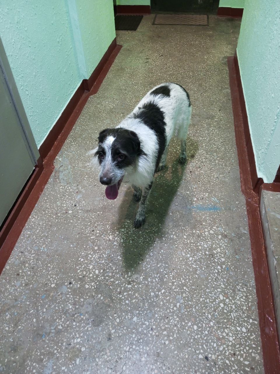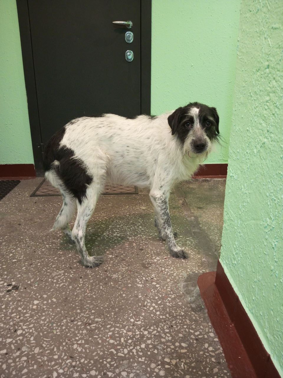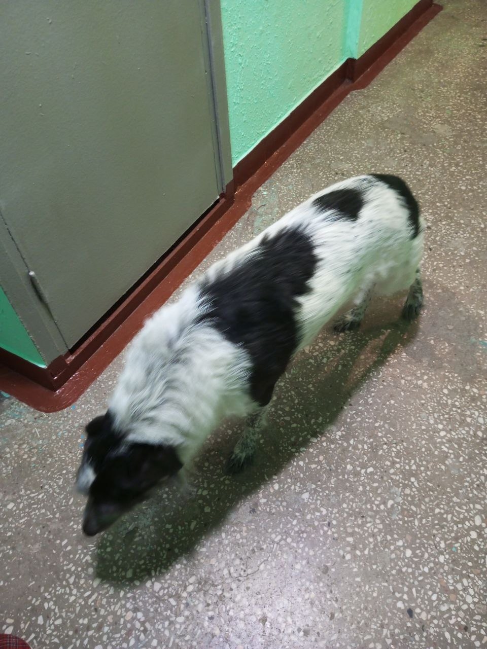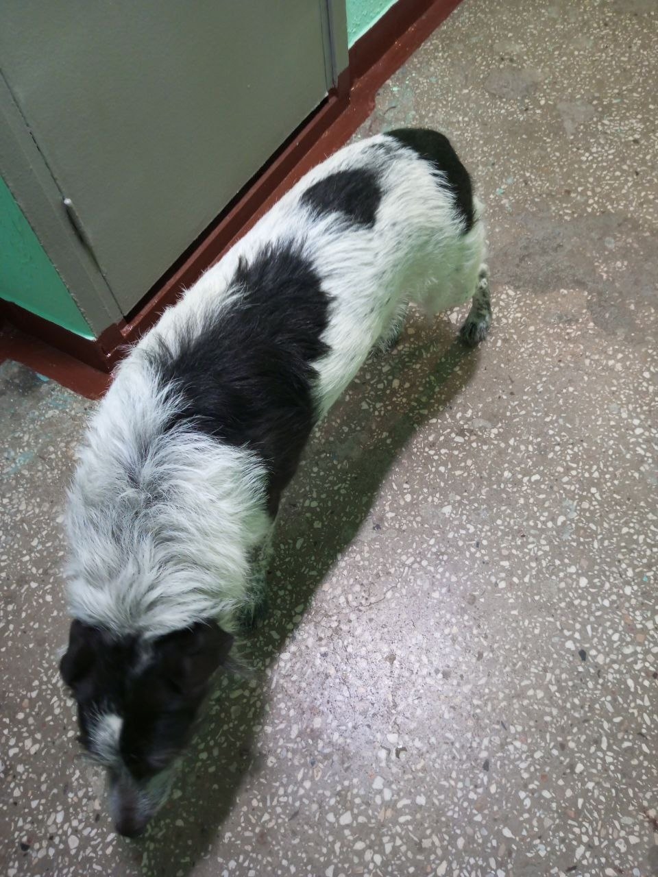 Самка чёрно-белая, метис, ошейника нет. На человеческий голос откликается, чистенькая