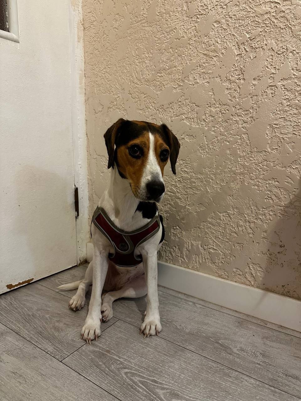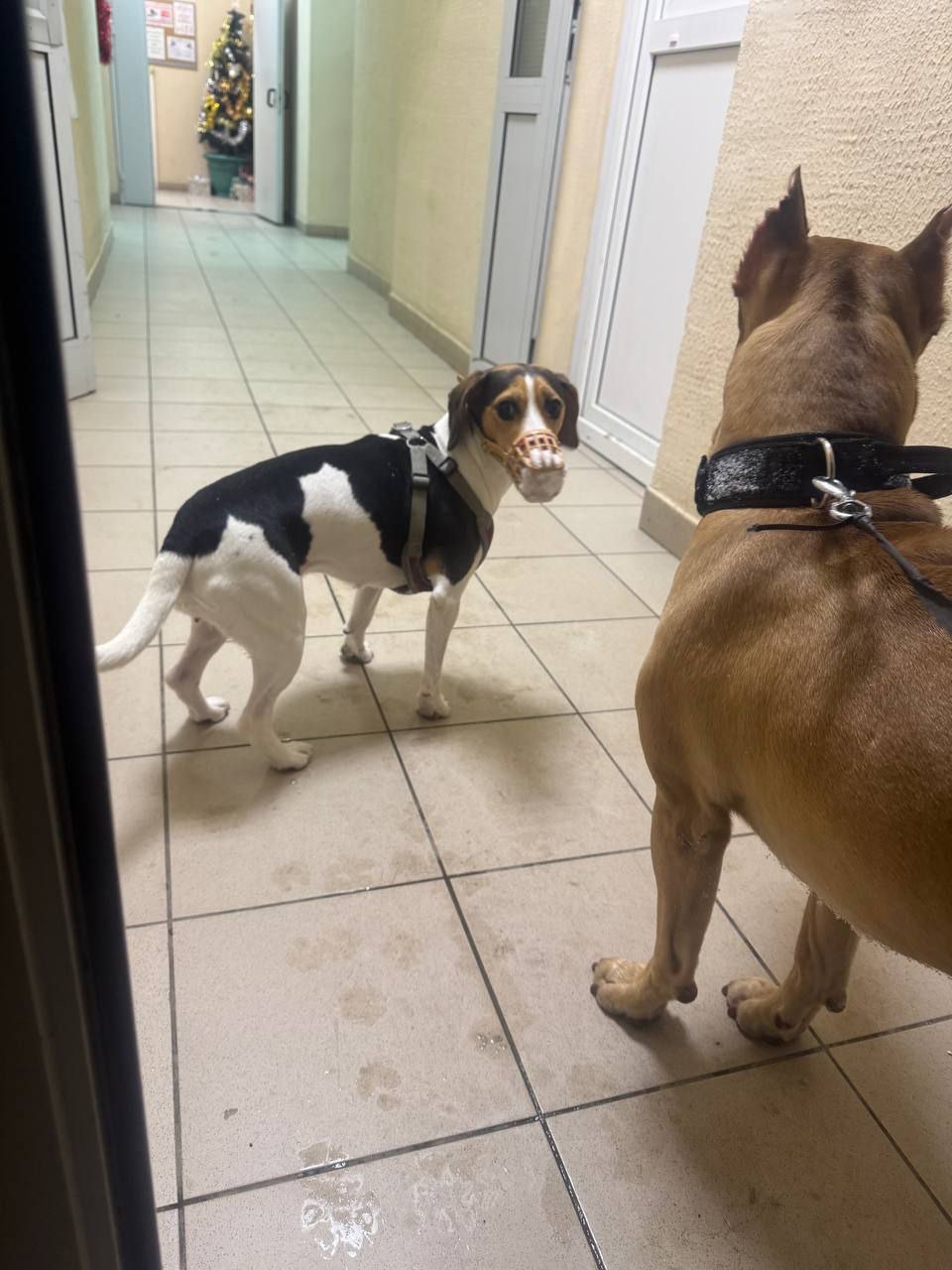 Найдена собака , на Астрадамской улице . Девочка. В наморднике и шлейке!