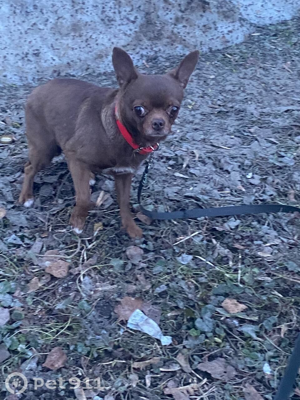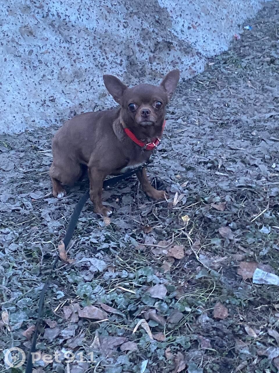 Шоколадного цвета, чихуахуа. Метро Выхино. Возле кинотеатра Волгоград. Прихрамывает. Ошейник красного цвета. Напугана