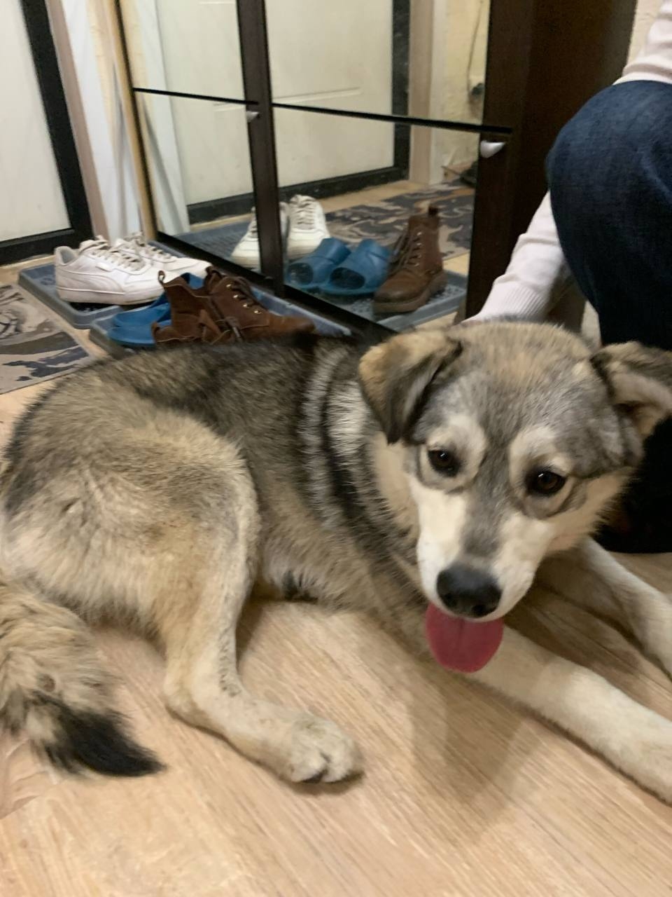 Найдена собака ЮЗАО метро теплый стан. Девочка (с течкой) по словам ветеринара год-полтора.  Очень ласковая. Был ошейник с неактивированным QR кодом. Ищем хозяина ( уже без особых надежд) или куратора, что поможет пристроить собаку новым хозяевам