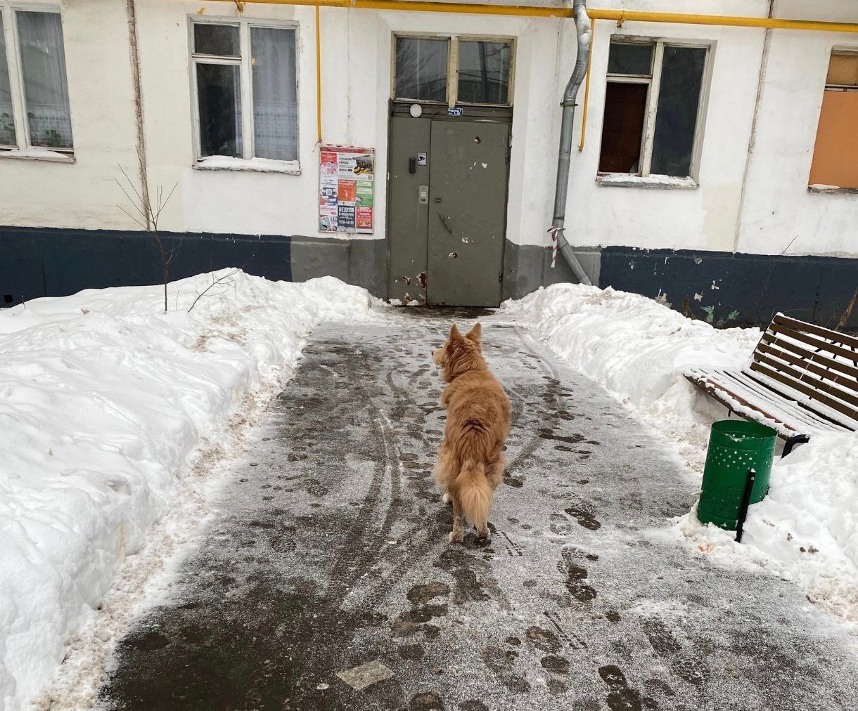 Средняя собака,окрас светло рыжий,кожаный коричневый ошейник.На морде белая полоса.Глазки узкие.Приходит в подъезд дома,сказали уже около двух недель.