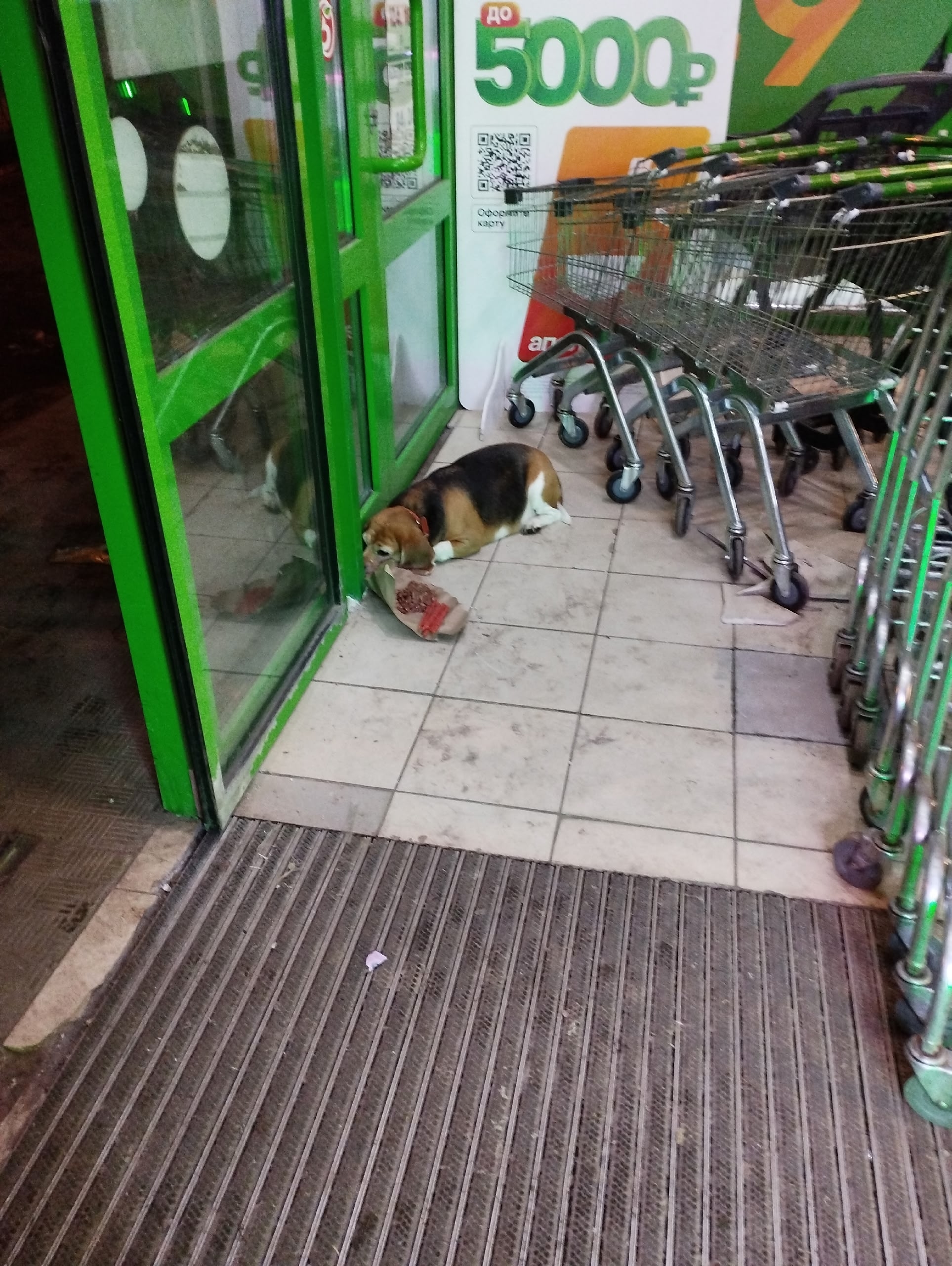 МО. Г. Балашиха, мкрн. Ольгино, граничная , магазин пятерочка. Уже второй день лежит собака. На вид домашняя с красным ошейником. На ошейнике ни номера ни чего нет.