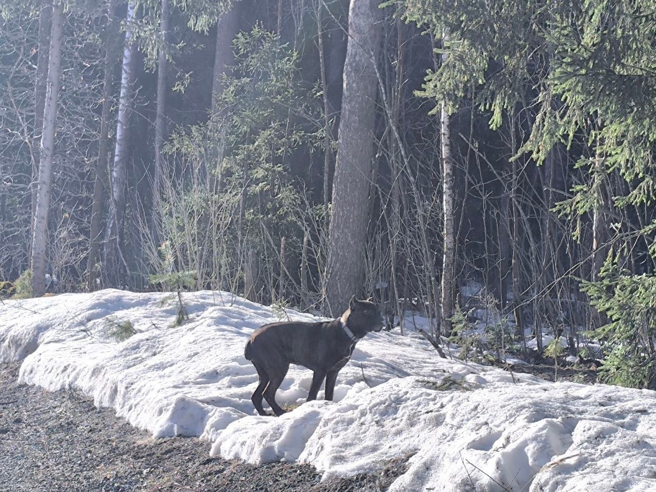 Вблизи деревни Кабаново Ногинский район у просёлочной дороги лежит собака. Темная. Тигровый окрас. Похожа на Кане Корсо. Девочка. Светло-серый ошейник.