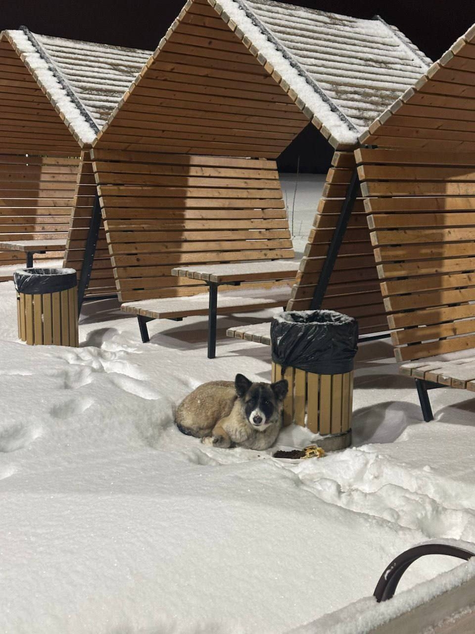 Пирожок есть не стала, дали корм, т.к едем со своей собакой и корм был с собой. Корм ест. Значит собака домашняя явно. Какого пола собака определить не удалось. У работников заправки спрашивали, собака появилась утром/днем 10 января, т.е вчера.