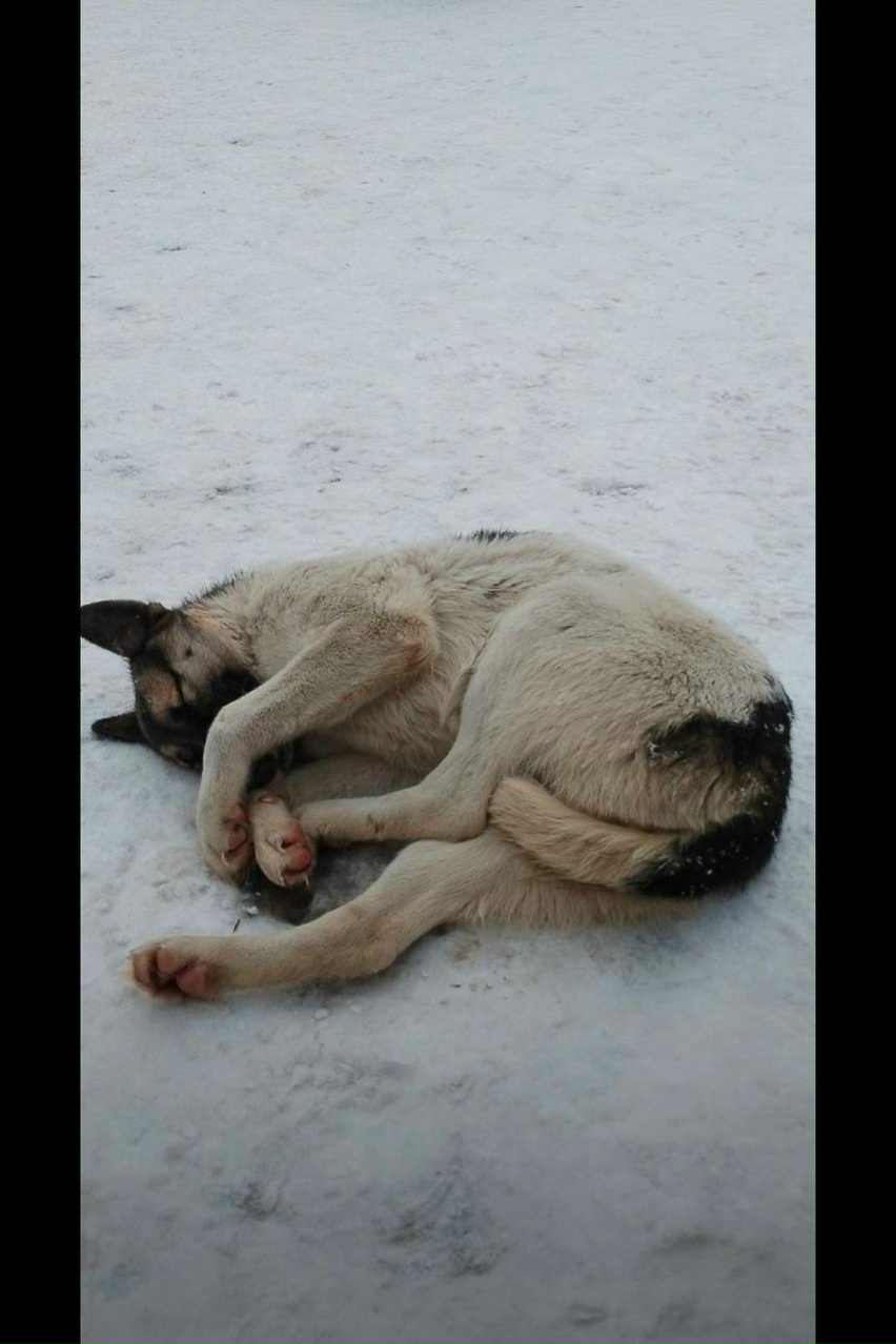У елки у драмтеатра собака ослабленная с клеймом спала, дрожала прям на площади у драм театра, проснулась голодная,