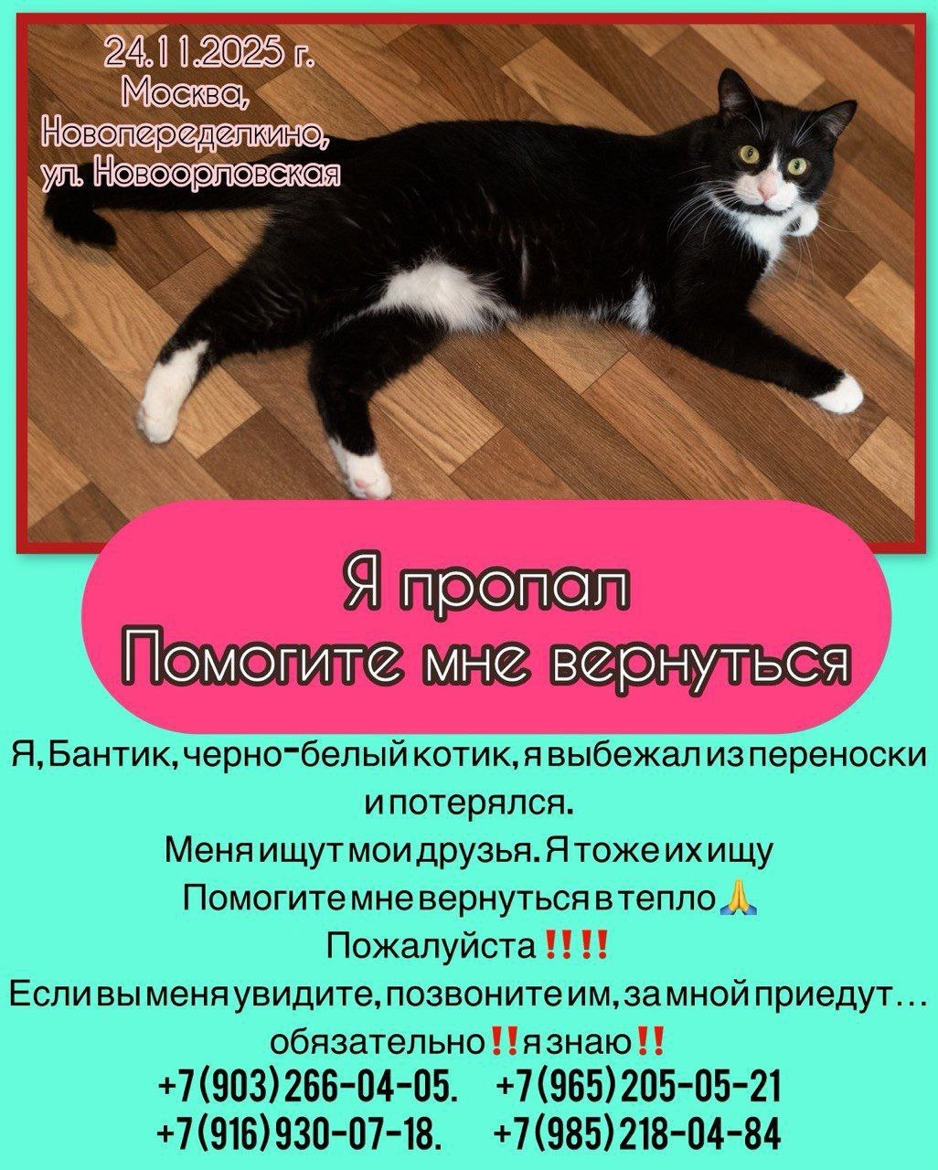 Помогите найти котика. Пропал 24 ноября 2025 года в Новопеределкино, улица Новоорловская. Окрас черно-белый. Если вы его заметите, пожалуйста, позвоните по телефонам +79032660405; +79169300718; +79652050521; +79852180484