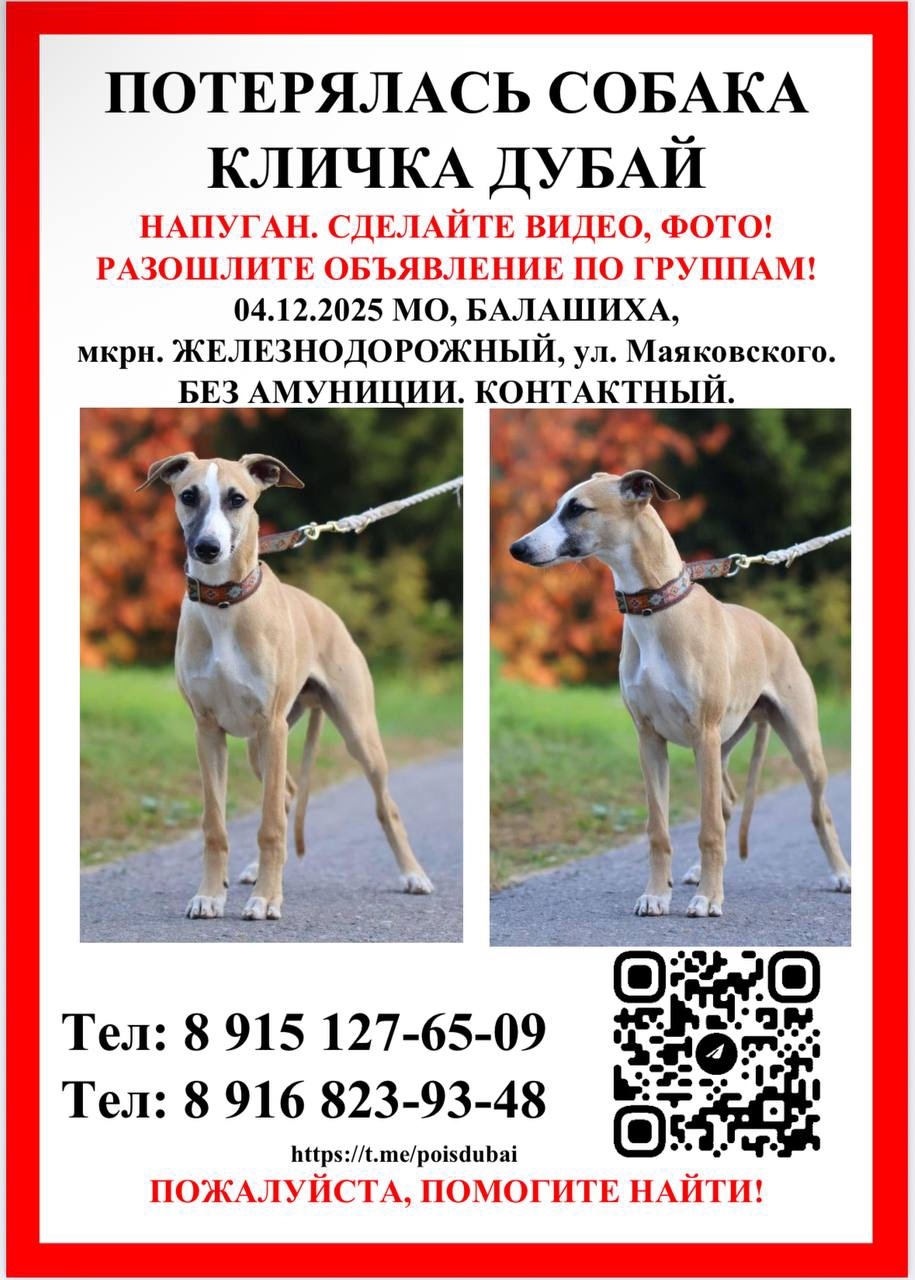Потерялась собака породы уиппет. Палевый окрас. Без амуниции. Контактный, но на стрессе может не подойти.