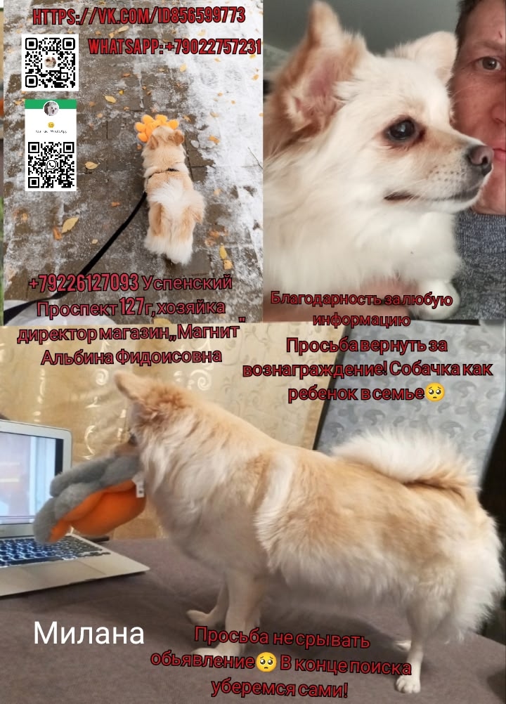 Потерялась маленькая бежевая собачка, породы немецкий шпиц, 3 годика, окрас рыжий с белым , кличка Милана. У собачки есть патология пищеварения и ей особый корм нужен😔 может кого у соседей видели похожую.