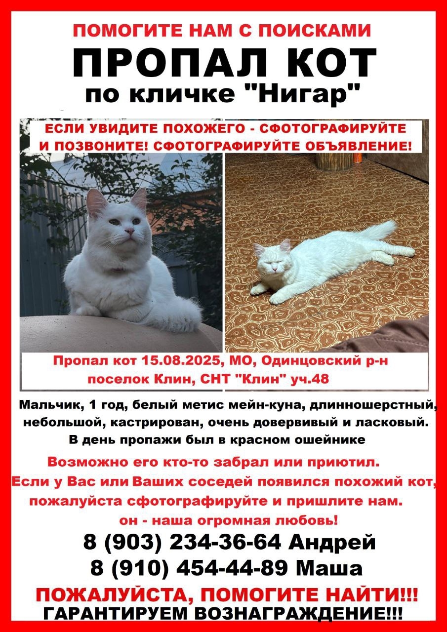 Пропал кот 15.08.2025, МО, Одинцовский р-н, поселок Клин, СНТ Клин, (недалеко от Кубинки)