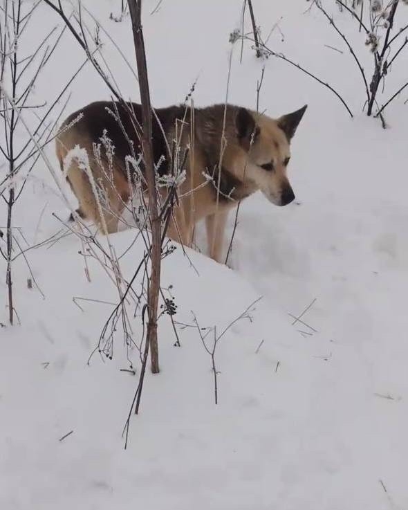 Собаке примерно 6-7 лет, кобель, фенотип овчарки. Амуниции на нем не было. Скорее всего был домашним. В привезенную мной  будку, я застелил одеяло, но он не заходит в нее, видимо не зная, что это. Сидит рядом с ней, покрытый инеем. В руки не дается, держится на расстояние. Езжу его кормить, это все, что могу, дома полно живности, взять совсем некуда. Сейчас морозы и будет еще холоднее. Боюсь, что он не выживет там, один.