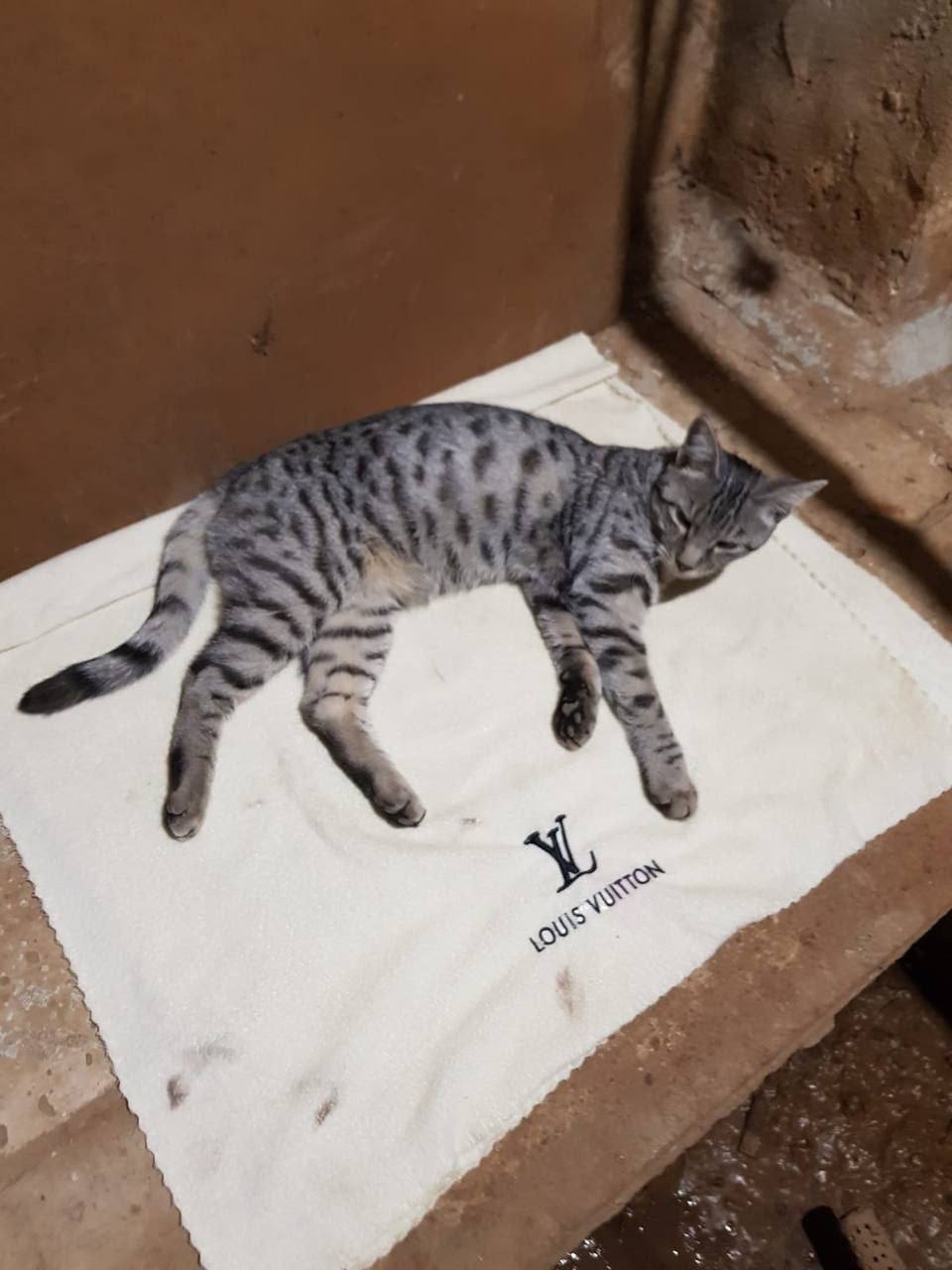Окрас мраморный, серый с полосками, вероятно бенгальский фенотип.