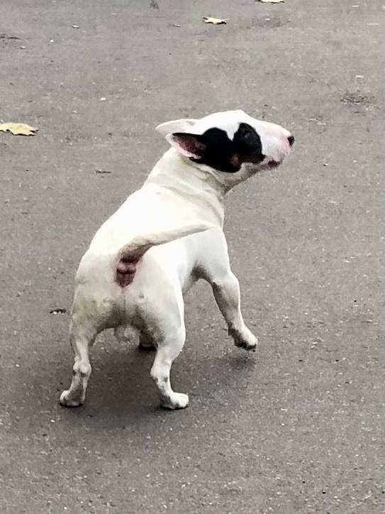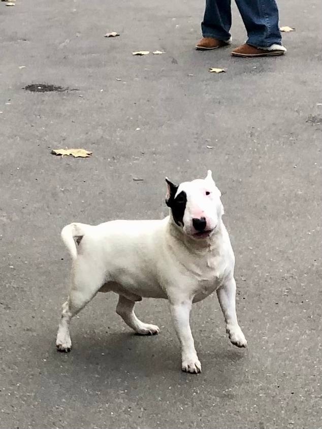 Белый бультерьер, общительный и контактный парень, без амуниции, бегал у WB