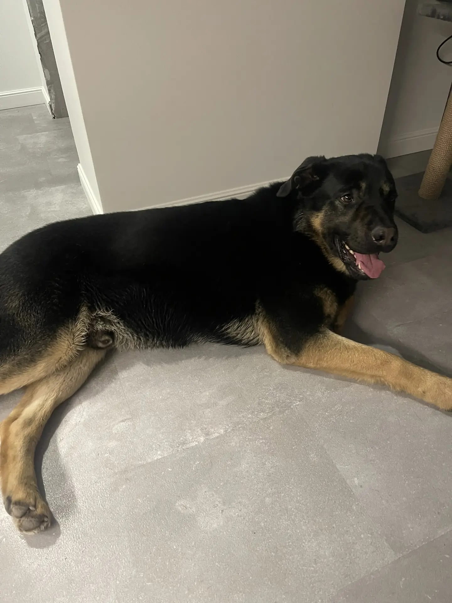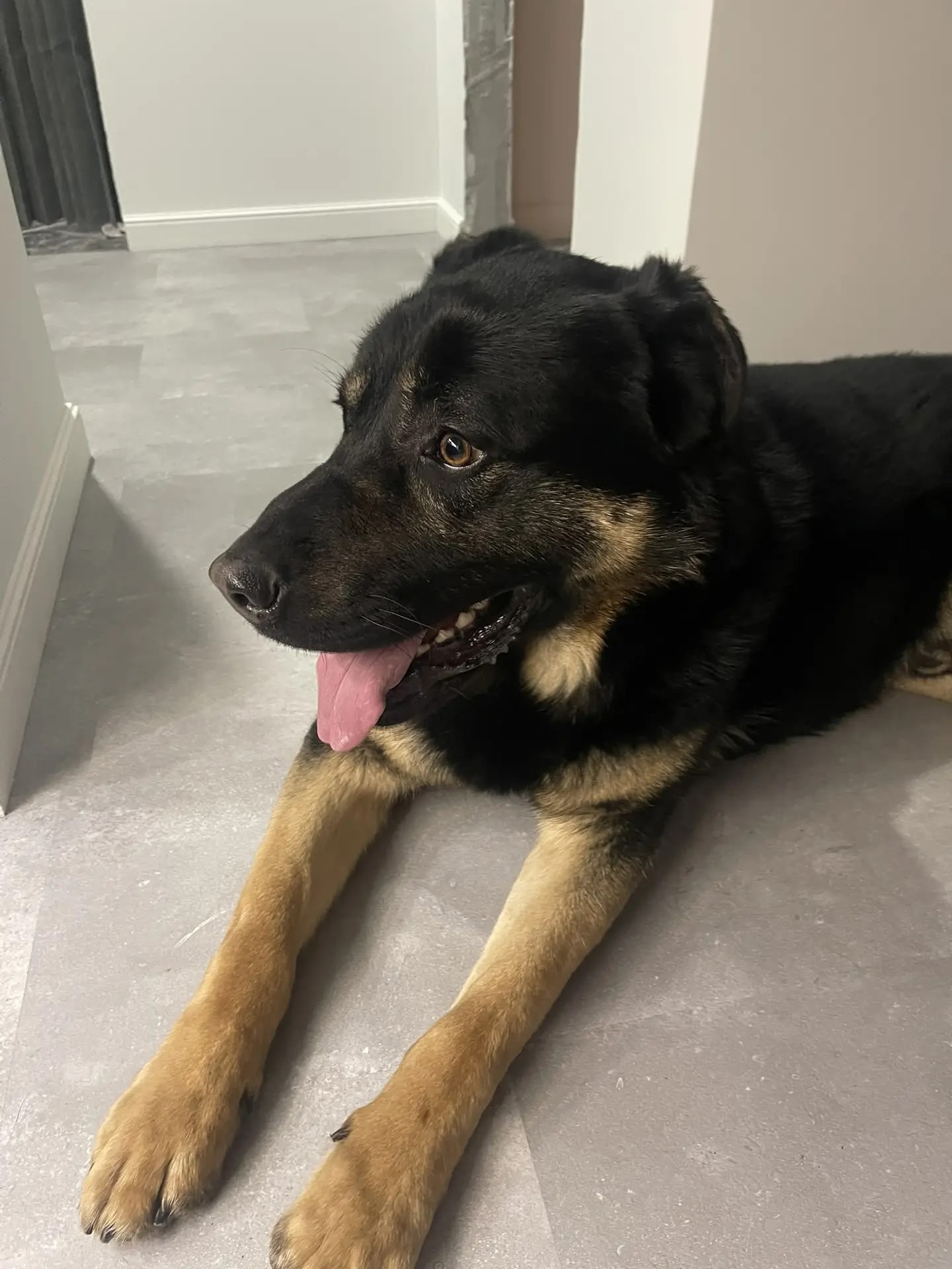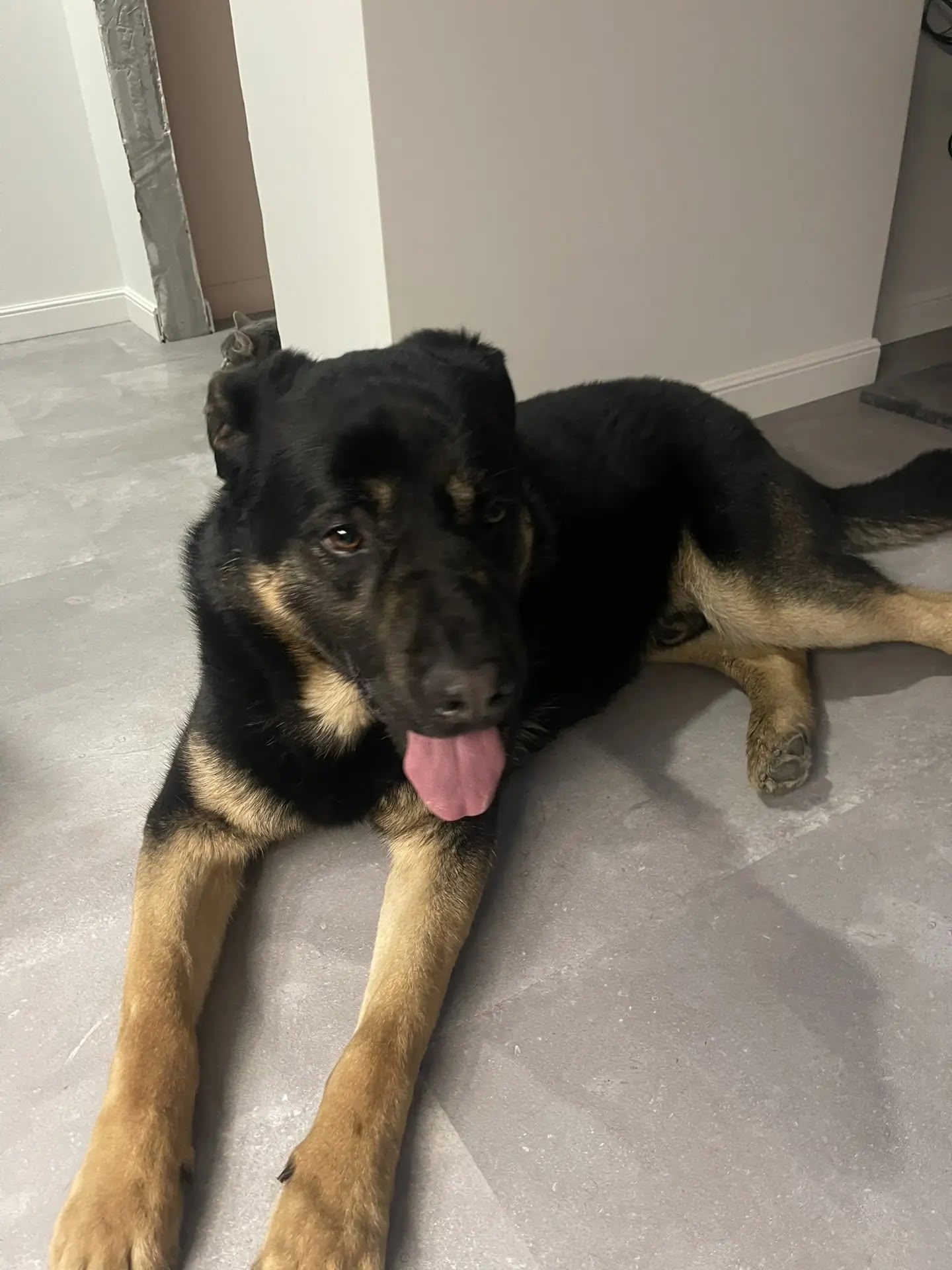 Кобель черно-палевый, крупный (побольше овчарки) и сильный, лапы мощные, ухоженный, прямая спина, красивая блестящая шерсть (короткошерстный), подстрижены когти, ушки чистые. Молодой (предположительно до двух лет) очень контактный, игривый, при этом не навязчивый, любит детей. Воспитанный, не обжора, еду не выпрашивает, терпеливо ждет, когда предложат. С руки берет очень аккуратно. За время, пока находился у нас, ничего не испортил. Вел себя очень достойно.