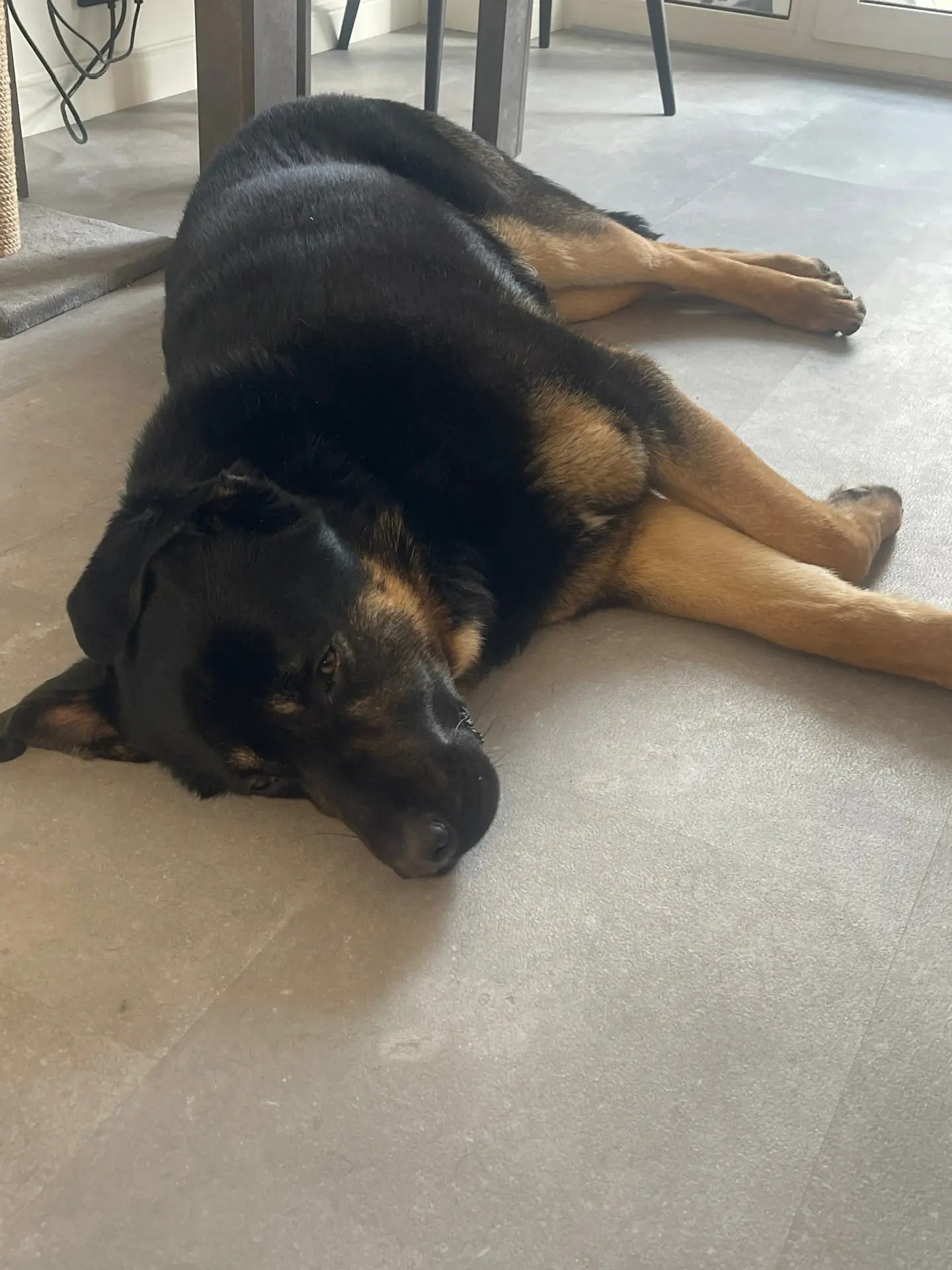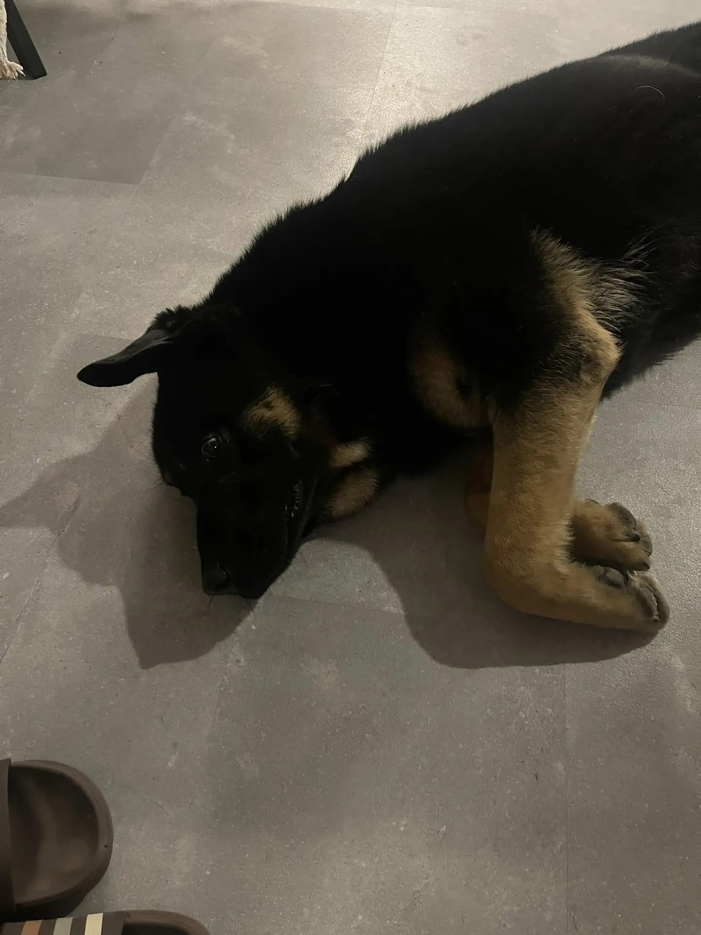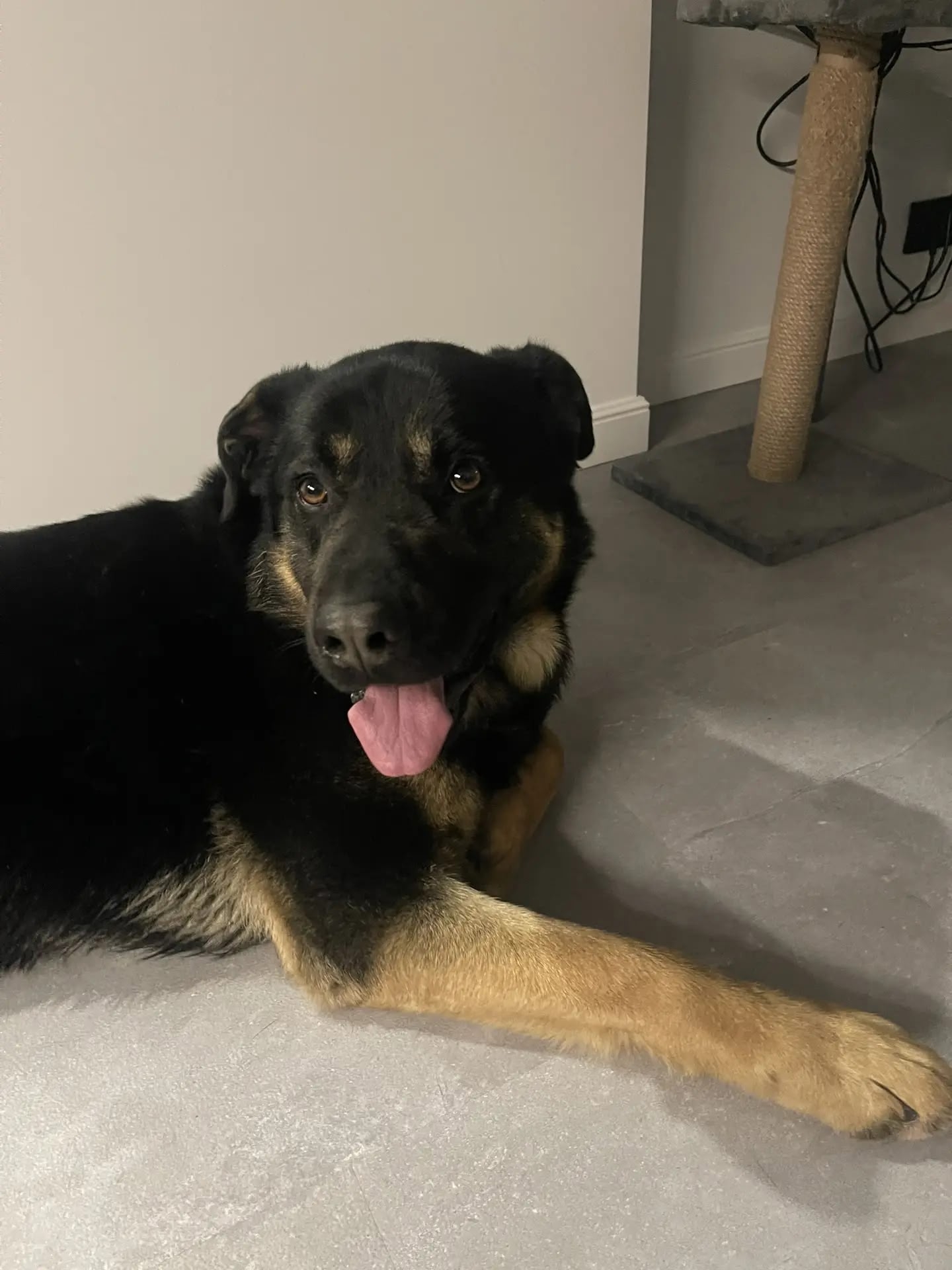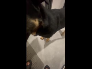Кобель черно-палевый, крупный (побольше овчарки) и сильный, лапы мощные, ухоженный, прямая спина, красивая блестящая шерсть (короткошерстный), подстрижены когти, ушки чистые. Молодой (предположительно до двух лет) очень контактный, игривый, при этом не навязчивый, любит детей. Воспитанный, не обжора, еду не выпрашивает, терпеливо ждет, когда предложат. С руки берет очень аккуратно. За время, пока находился у нас, ничего не испортил. Вел себя очень достойно.