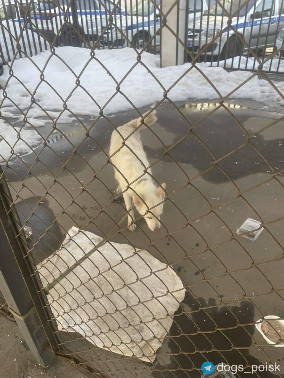 Чья белая собака? Была привязана к дереву. Хозяин не найден. Собака была передана в ОВД.