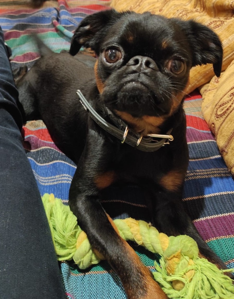 Пти-брабансон, кобель, цвет черный с подпалом, на шее серый ошейник. Чипирован. Есть проблемы со здоровьем, требуется спец.питание и периодическое лечение