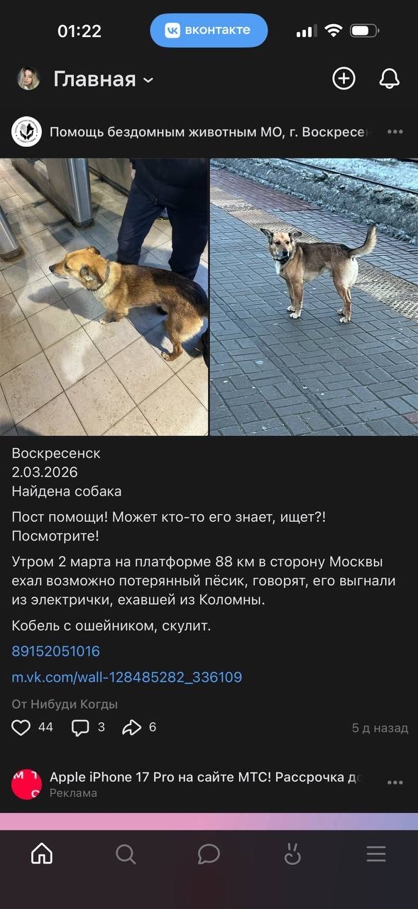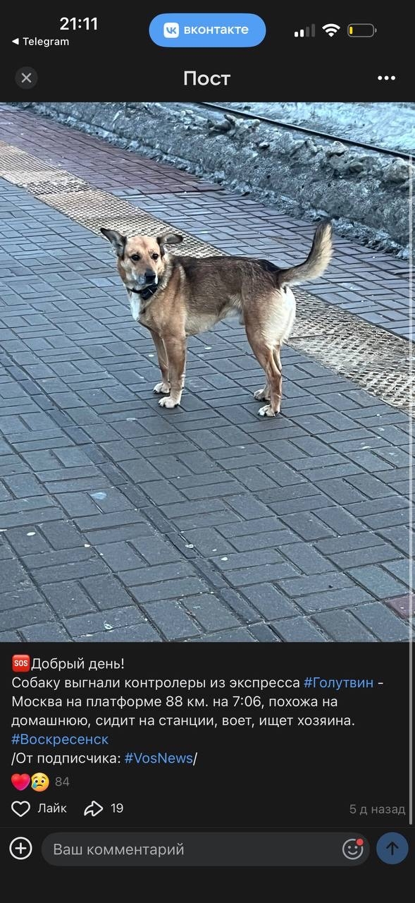 Пропала собака МО, Воскресенск мог уехать на электричке..