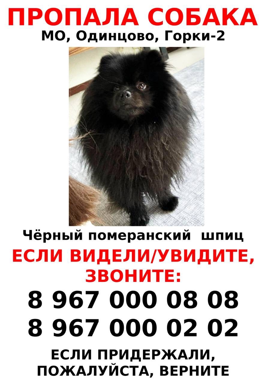 Черный померанский шпиц Лёва. Предположительно украл курьер. Частная территория поселка. По камерам и времени выезд машины и пропажа собаки совпадают.