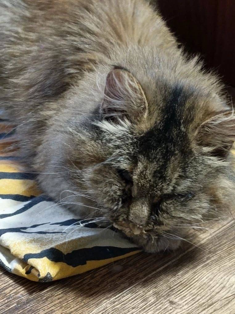 Была найдена пушистая кошка в очень плохом состоянии.