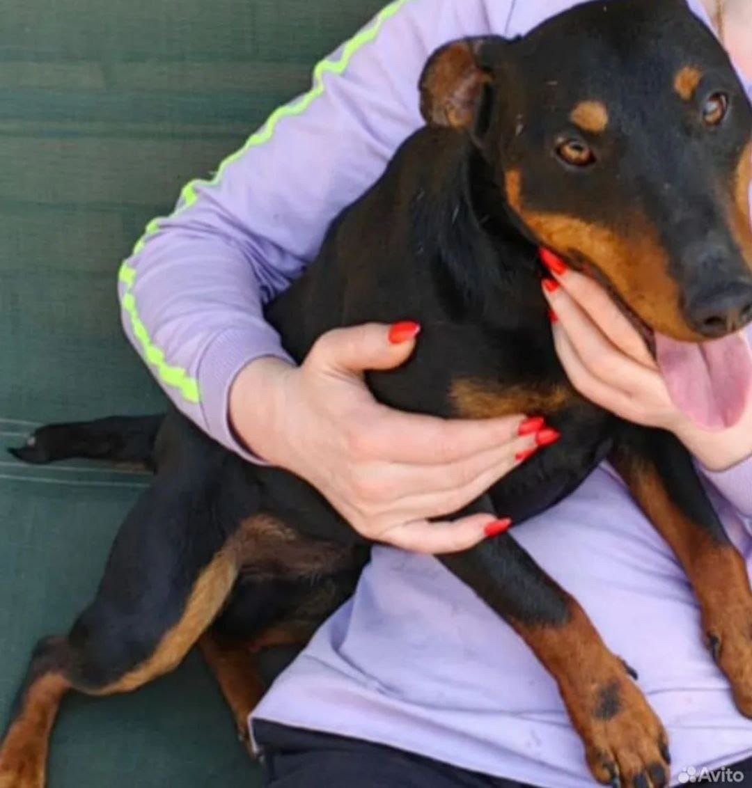 Был без ошейника, хвост купированный, на передних лапах рисунок в виде корон.