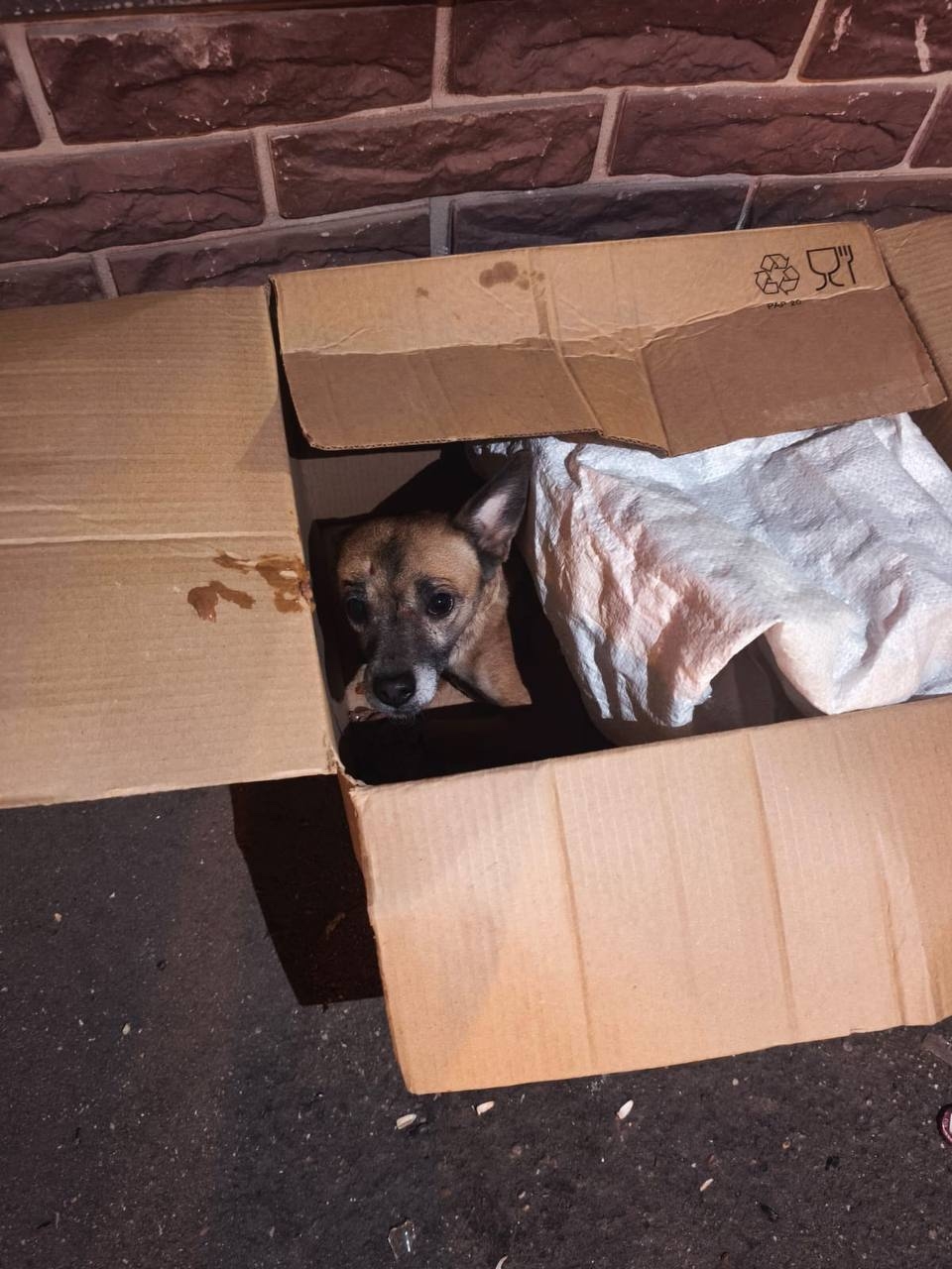 Была сбита собака. Собака в ошейнике. Неравнодушные убрали её с дороги и положили в коробку рядом с магазином «Пятерочка».