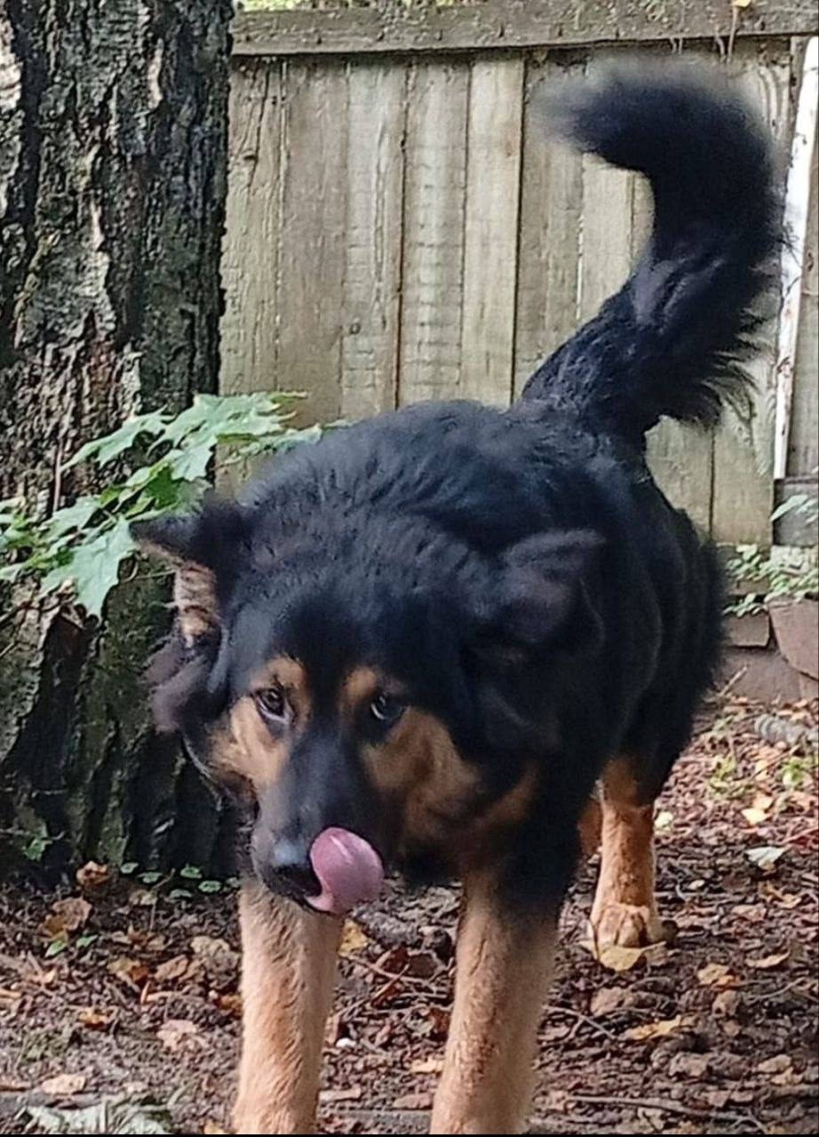 Добрый, похож на овчарку, ходит около дома, где его подкармливали.