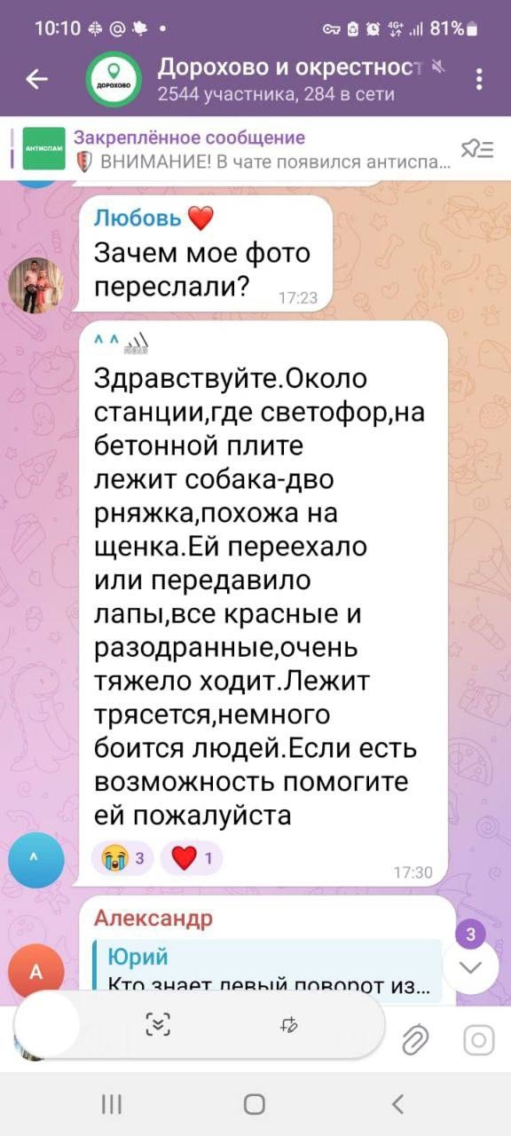 Собака в беде 🆘🆘🆘🆘🙏🏻🙏🏻🙏🏻🙏🏻Доброго дня! Прислали такую информацию, что на ст. Дорохово лежит собака с перебитыми ногами. Кто может помочь??? 🙏🙏🙏