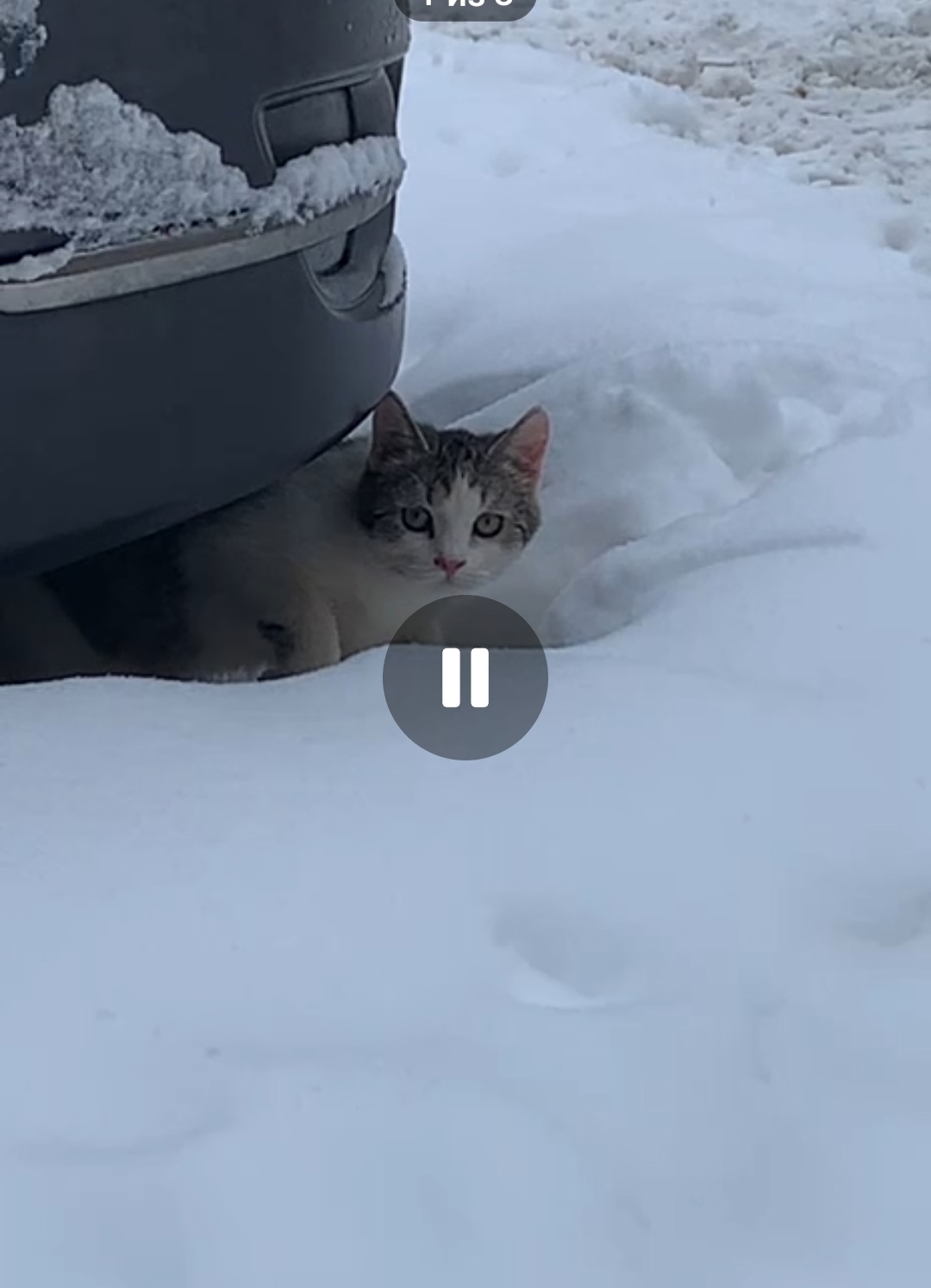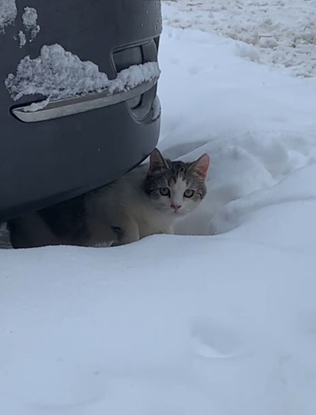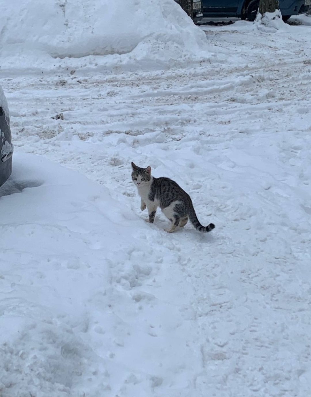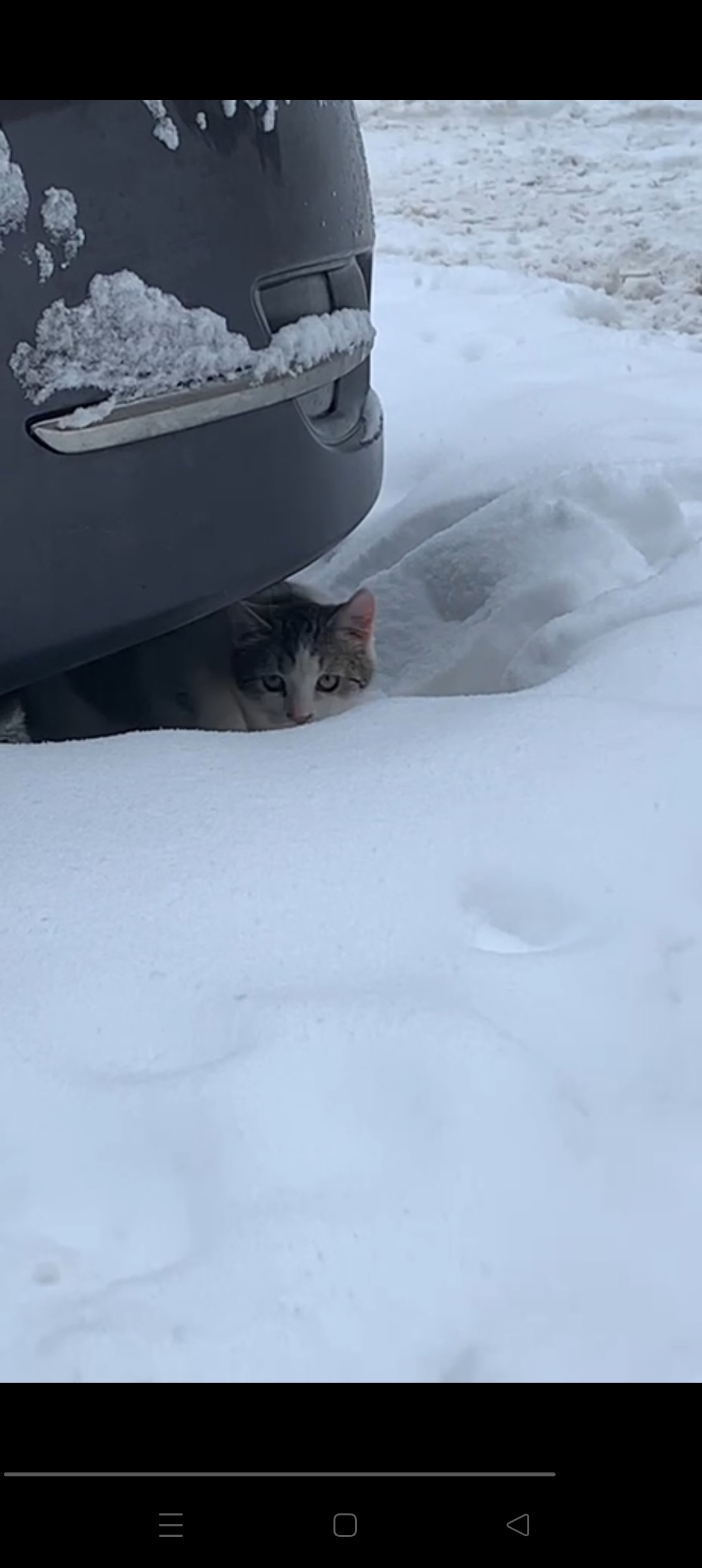 Ищем дом для игривого, которебенка! Малыш очень растерян, везде ищет маму , но ее забрали, ласковая кошечка.Котику примерно 8 мес. Играет под машиной в снегу, пока его убежище…