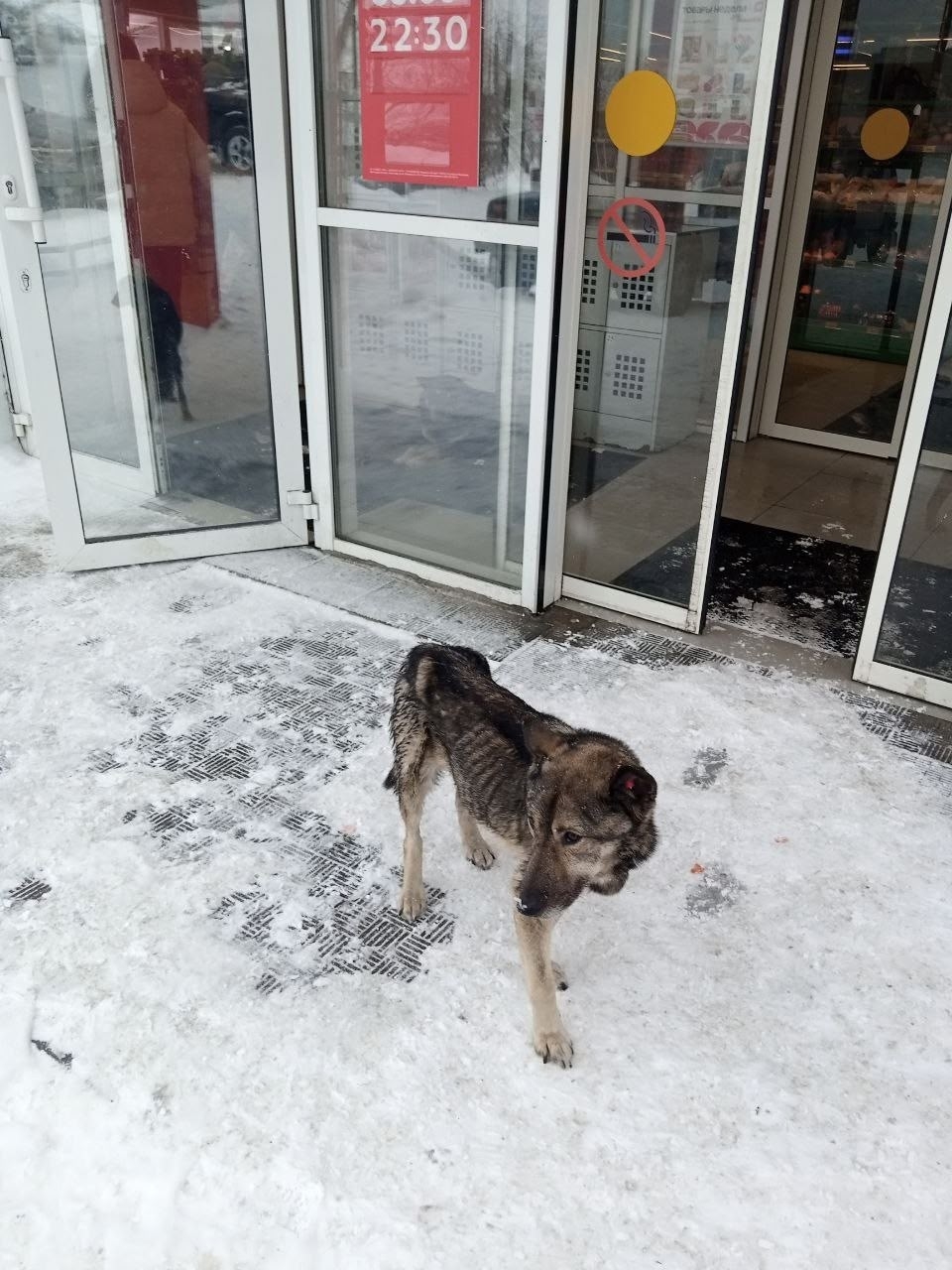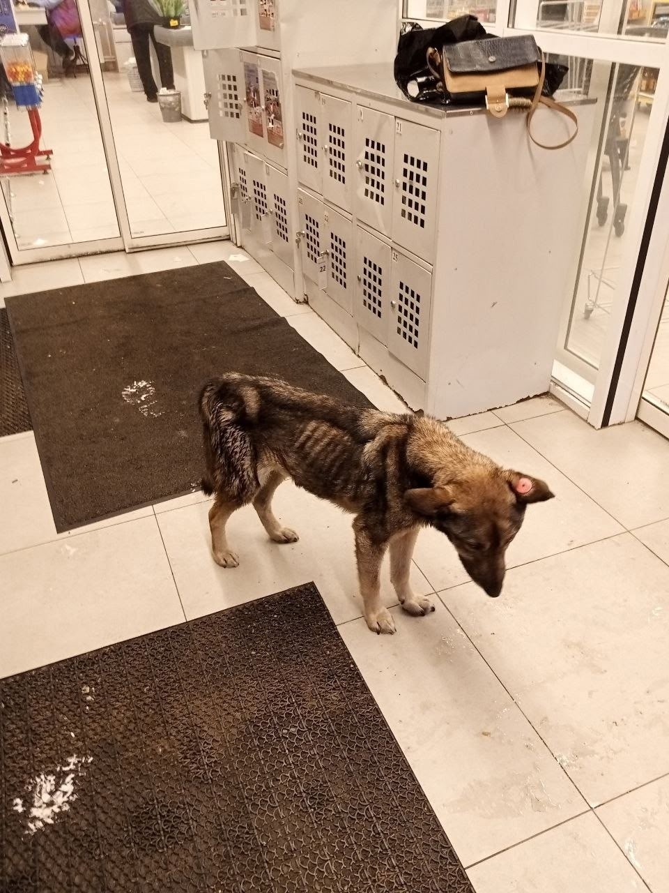Рекс дошёл до состояния скелета, он мёрзнет. Днём сердобольные продавцы запускают его в магазин погреться.