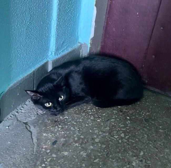 Чёрный окрас, находится в подъезде.