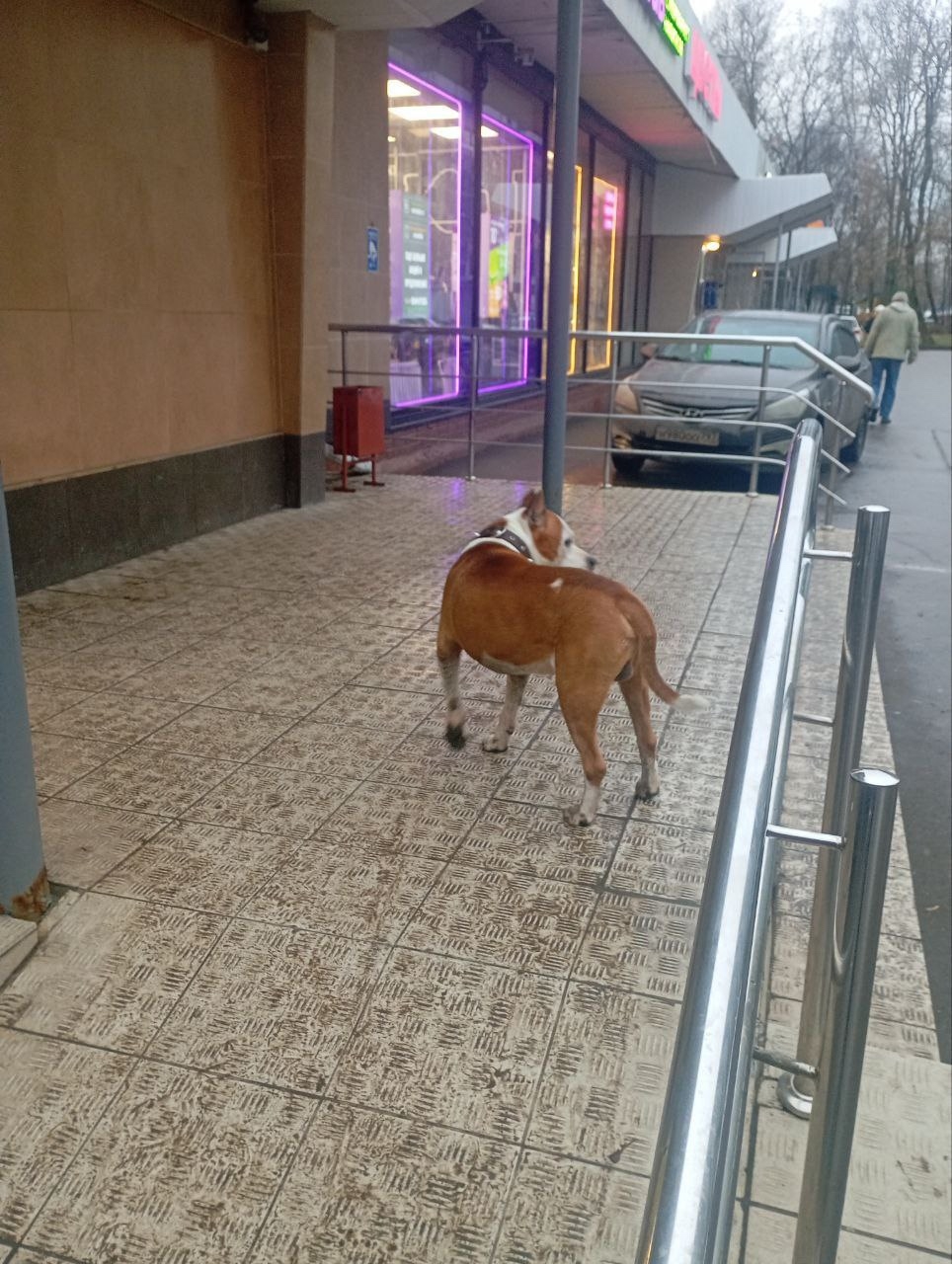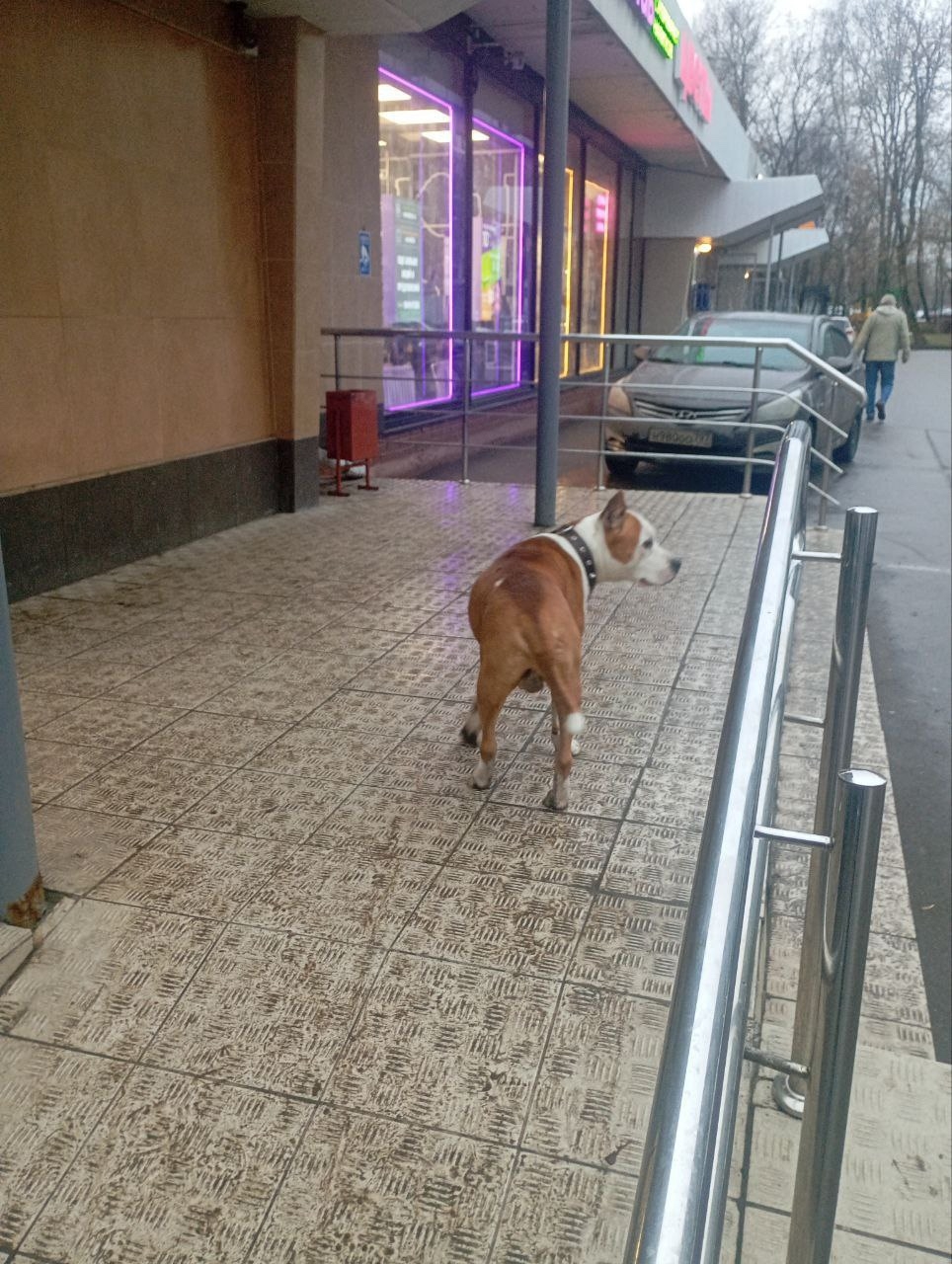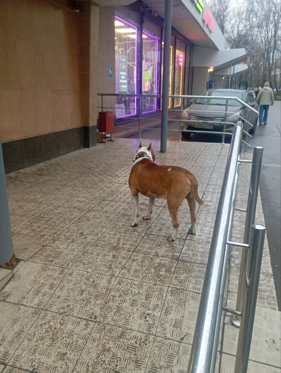 СВАО .Замечена собака белый с рыжим стафф , кобель. На углу напротив улицы Тайнинской д 15 _ через дорогу ..подошёл к отделению сбербанка и стоял минут 10. Хозяина не видно и в отделении тоже собаку никто не признал. Не придержан.был замечен 17.12 2025 в 14 30