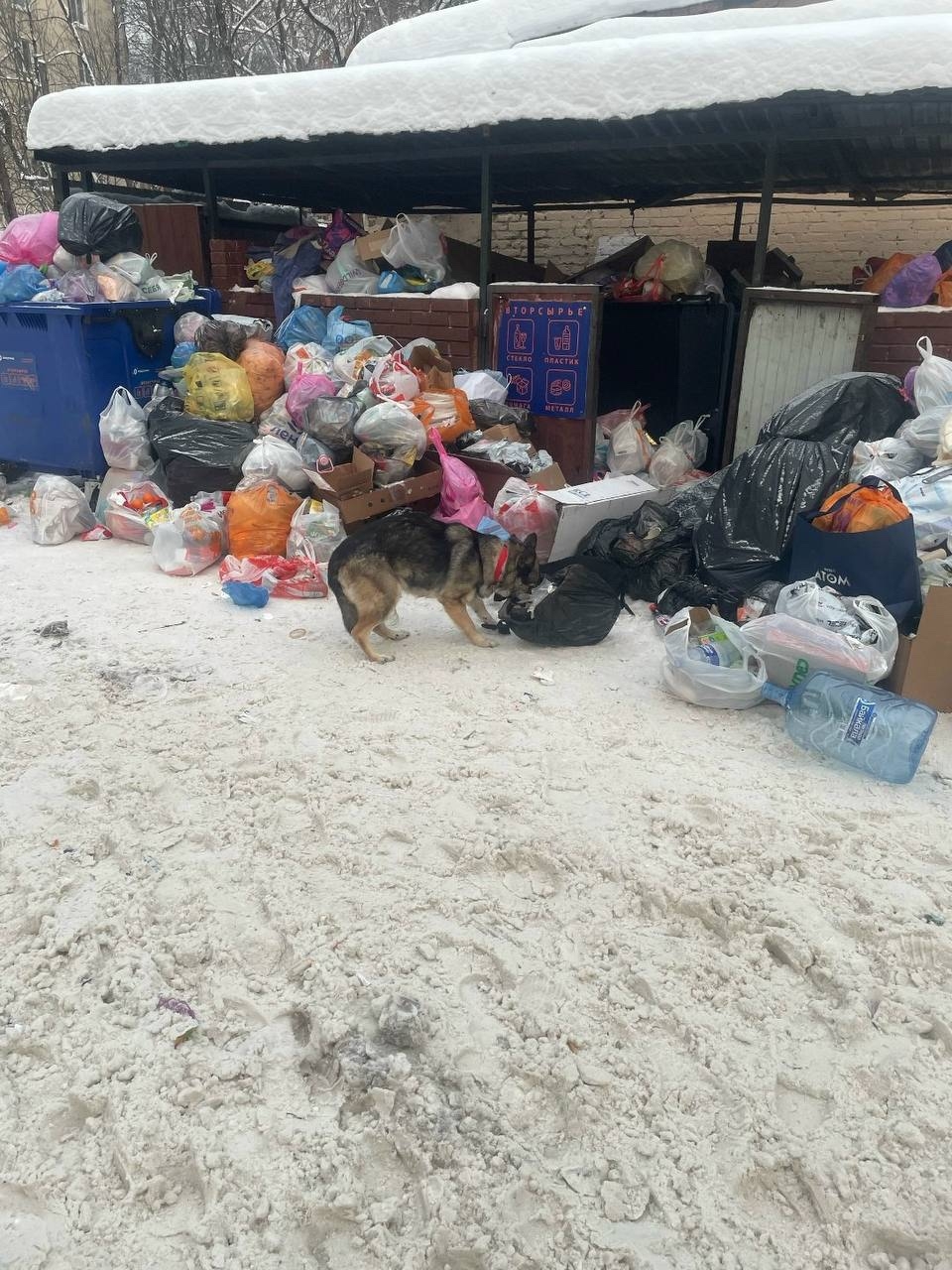 Около помойки 2 собаки в одинаковых ошейниках. Одна из них такса, на улице ей видно, что холодно. Другая в красном ошейнике, черно-рыжий окрас.
