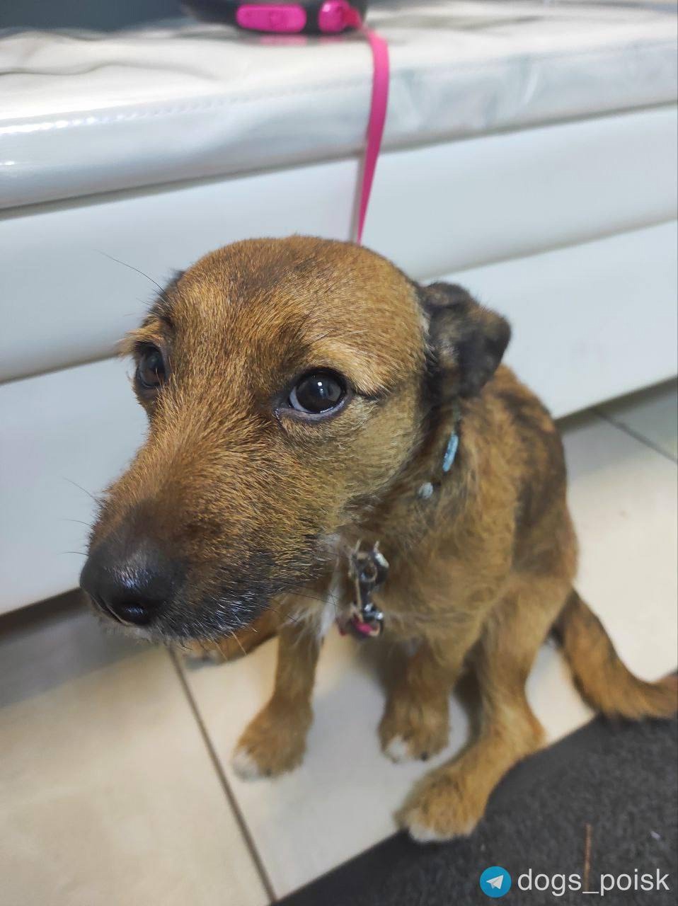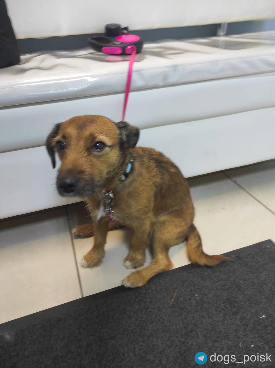 На вид щенок, цвет рыжий-коричневый, светящийся ошейник