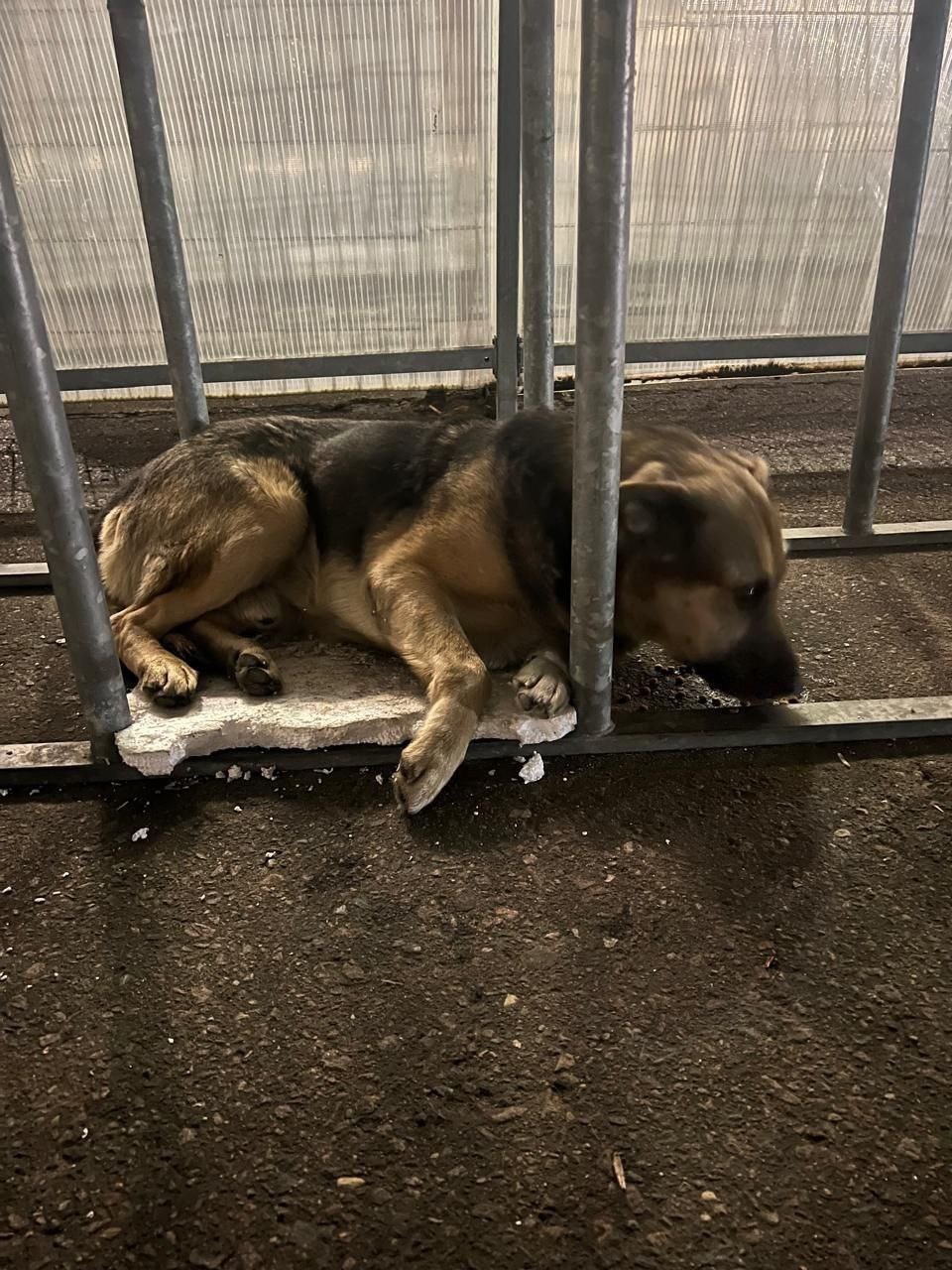 Лежит грустный, хромает на лапу, которая была видно травмирована.