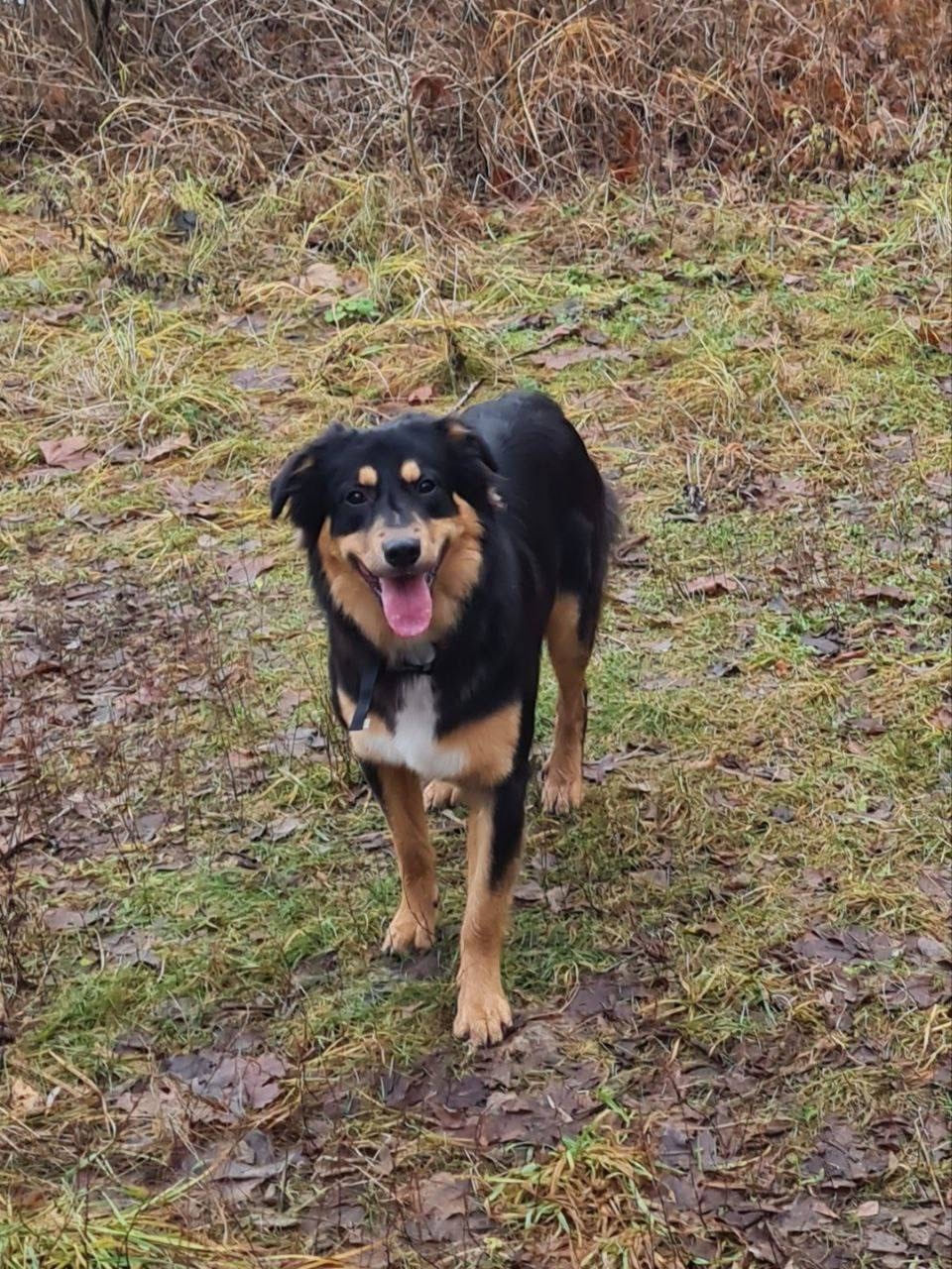 Встретили молодого пса около причала на Тасманской улице и он, играя, проводил нас через мост и вдоль противоположного берега по Живописной улице, но при попытках подозвать или поймать сразу убегал. На шее чёрный и розовый ошейник. Окрас черно-коричнево-бежевый.