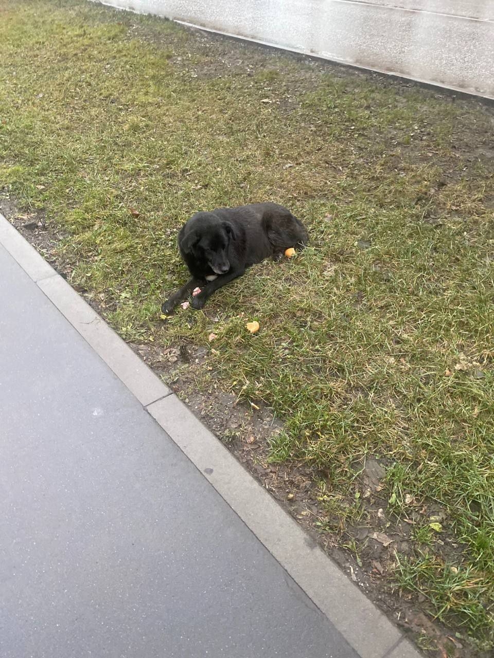 Лежит собака черного окраса, может сбита, может нет, нужна помощь машиной