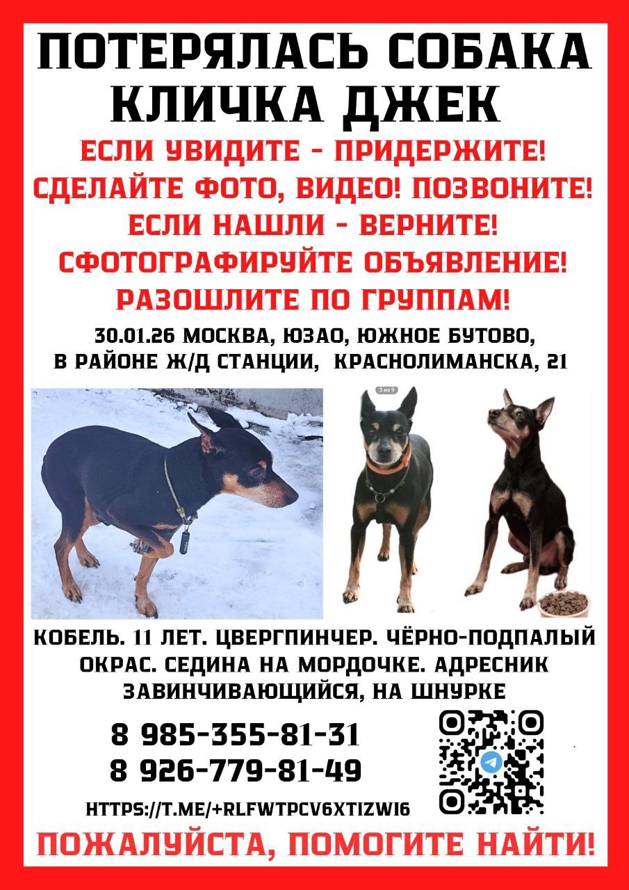Здравствуйте, помогите пожалуйста с поиском😭🙏Потерялась собака цвергпинчер 30.01 в южном Бутово Краснолиманская 21 .Кобель по кличке Джек, на шее адресник, купирован,добрый , контактный , на кличку отзывается , собаке 11 лет борода седая.