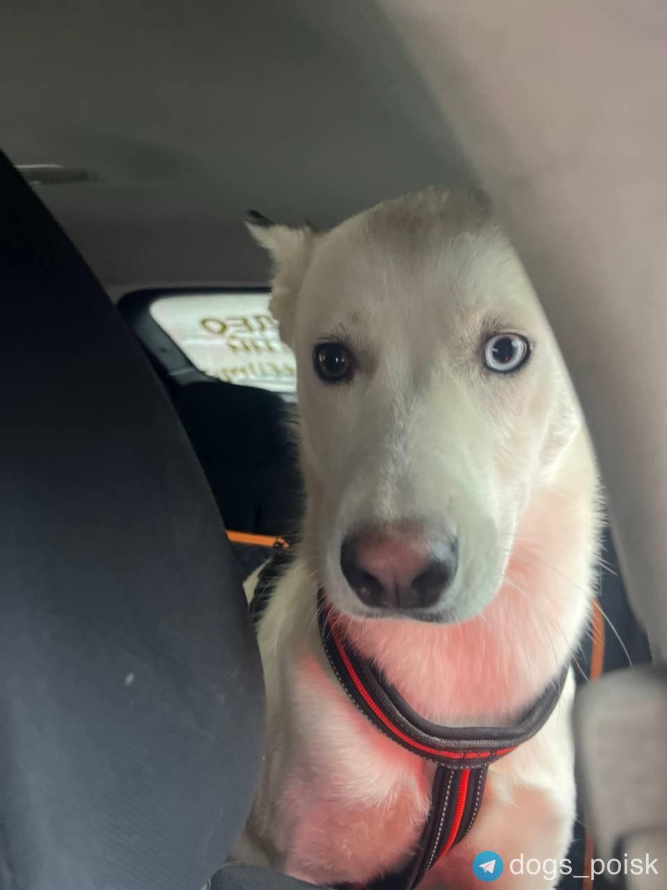 Нашли такую красотку. Металась в панике через дорогу, чуть не угодила под колеса. Девочка в красно-черной шлейке. Белый окрас, разные глаза.