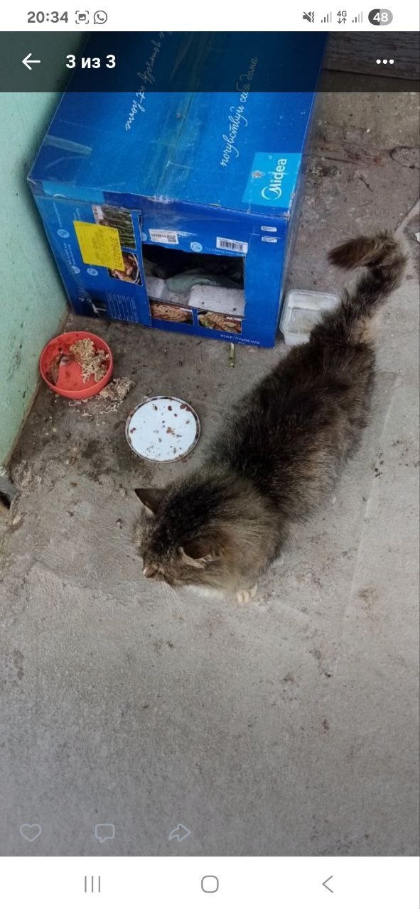 Её кормят, но ей угражает опасность, уже хвост подпалили. Простудила глаз, спит в коробке.