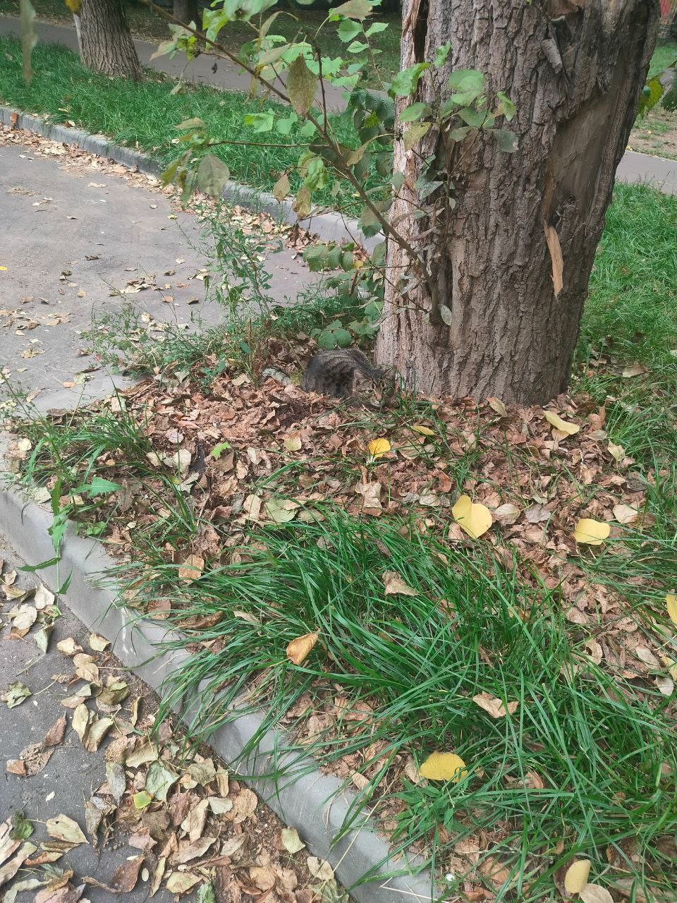 Небольшого размера котик или кошечка, ухоженный, расцветки серо-полосатой (тэбби), мордочка характерная, немного ориентальная, глаза близко посажены. Спал под деревом в куче листьев, осторожно положила еду, когда отошла, пооел, но близко не стала подходить, т.к. был готов убегать. Вдруг у кого-то пропал? 🙏 Чистенький, как будто не уличный