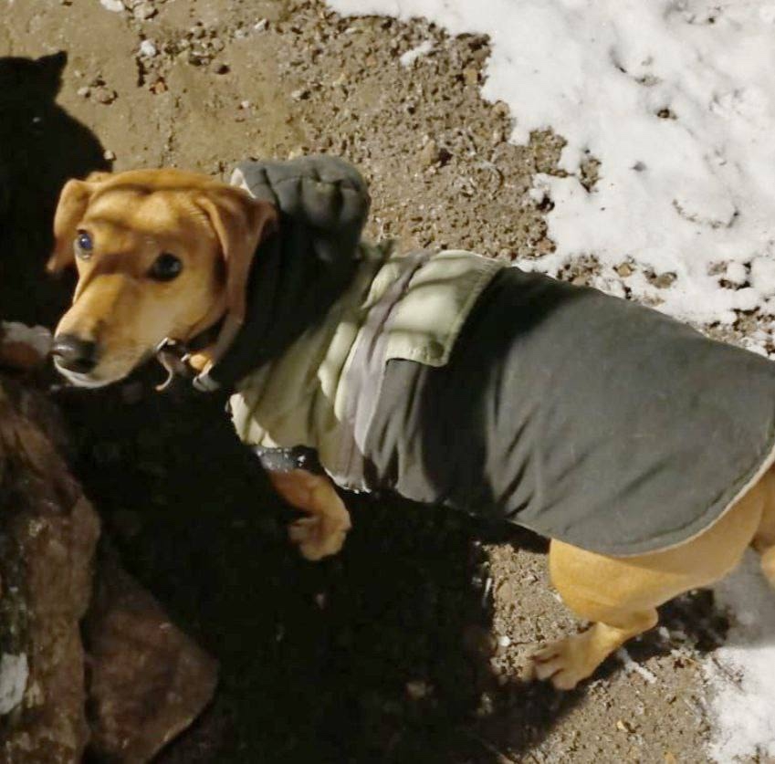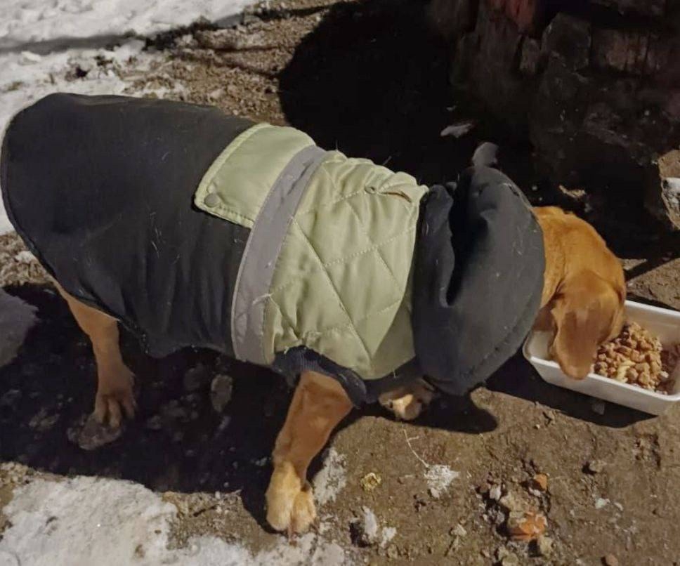 Пол не известен, рыжего окраса, в ошейнике и в утепленной жилетке с капюшоном. Без владельца, подьедала корм уличных кошек.