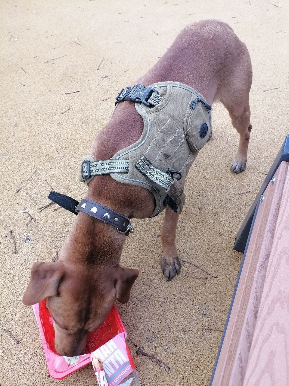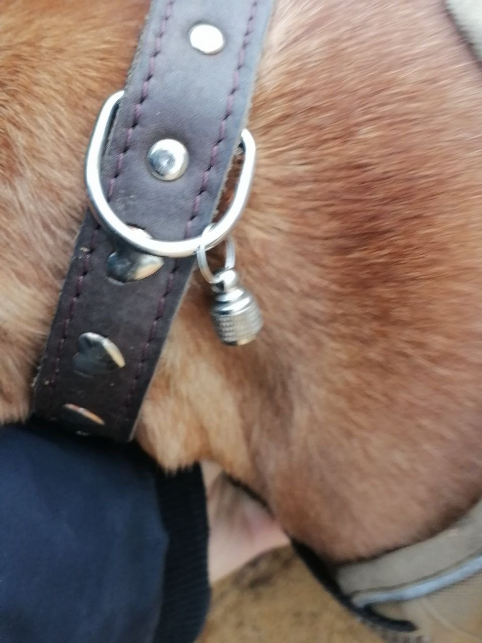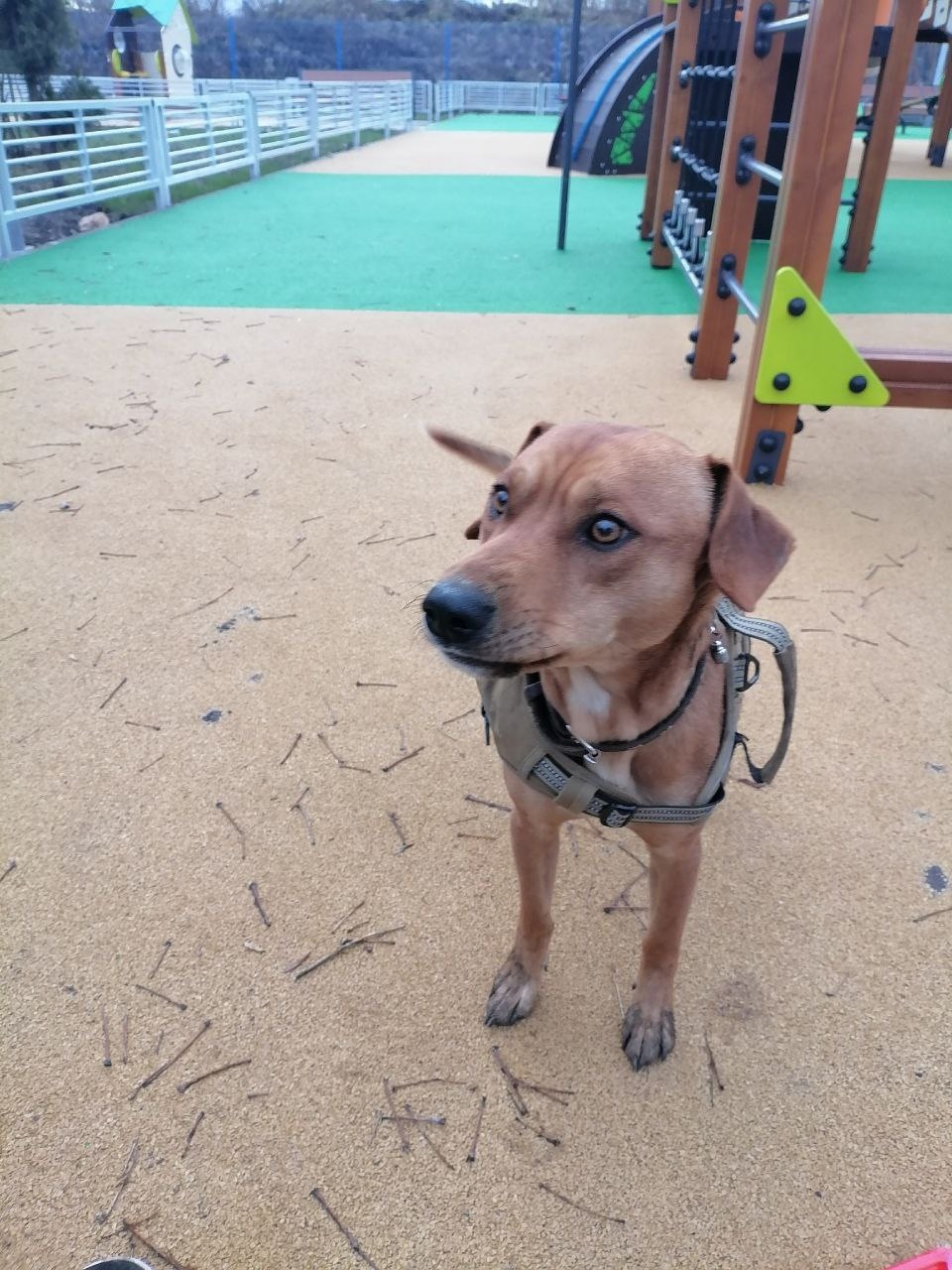 Одинокая собака бегает по анискино, адрес оторван, худая, дружелюбная, с шлейкой и ошейником