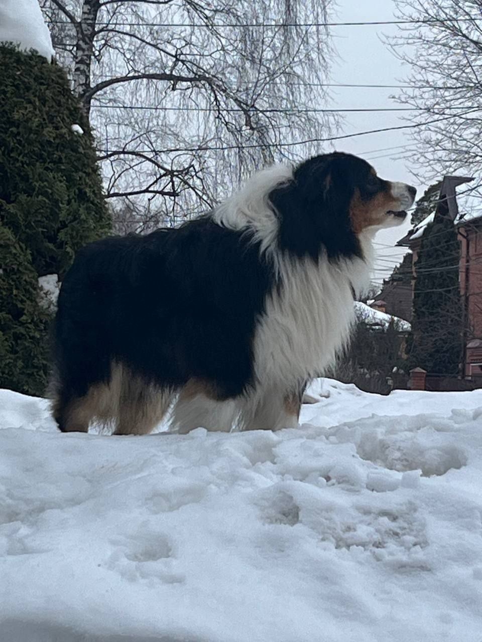 Аусси. Особые приметы – без хвоста, оранжевый ошейник (или с оранжевыми вставками, точно не разглядела).