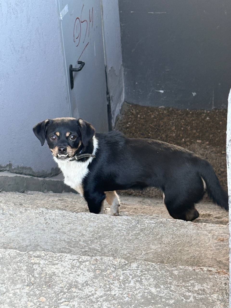 Замечена короткомордая трехцветная собака, некрупная, есть особенности по строению нижней челюсти (перекус), в ошейнике.