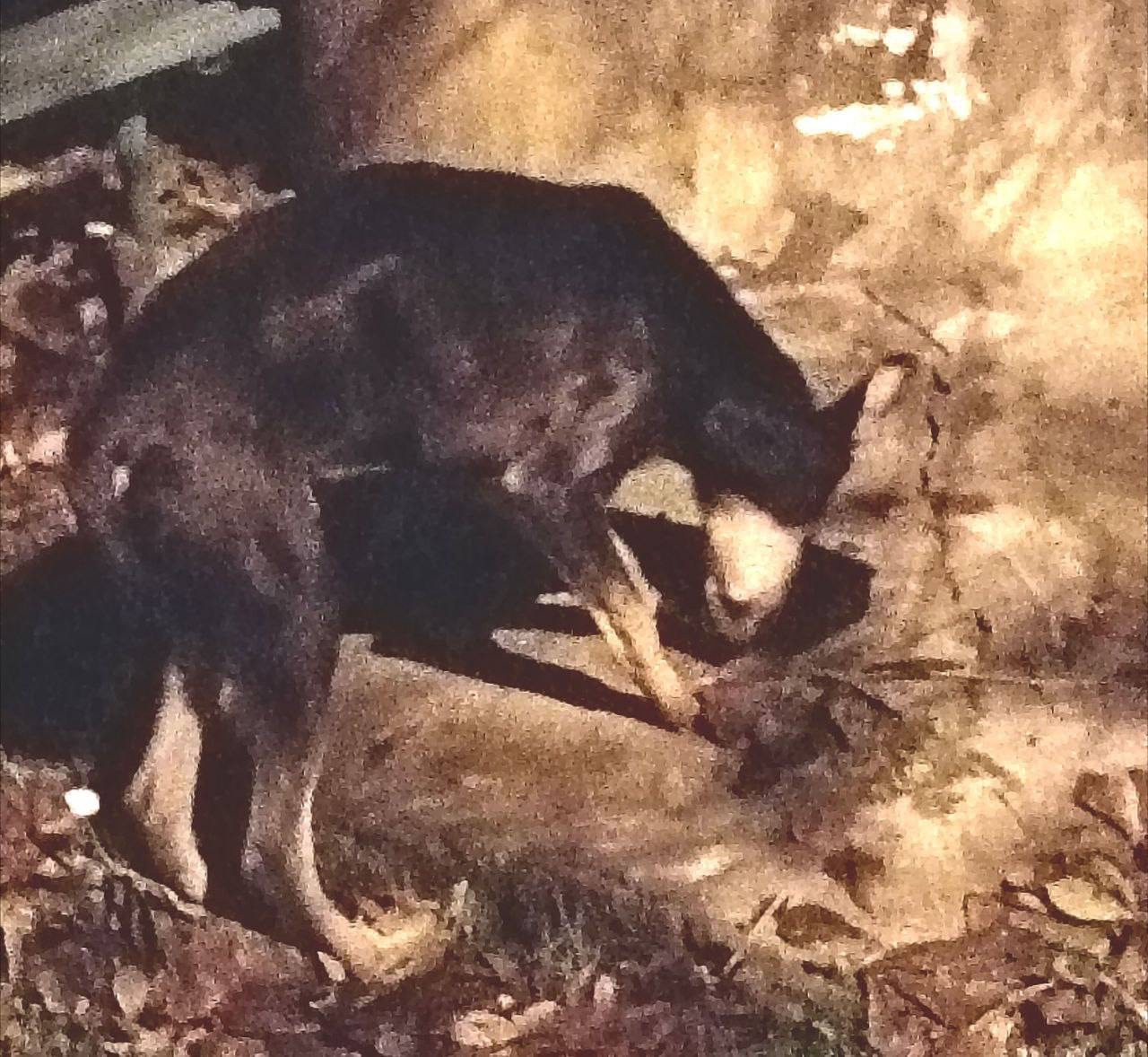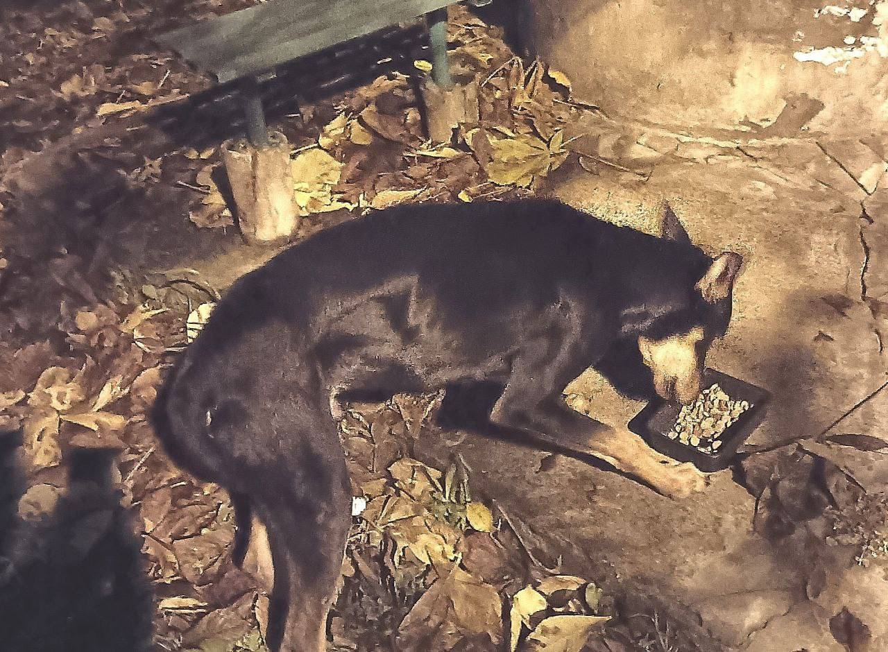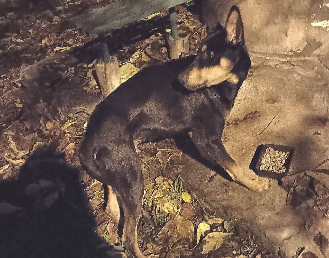 Появился пару дней назад молодой кобелек, практически щенок, хвост длинный, уши не купированны, очень чистый, но худой метис добермана, а мб и доберман фото сделала, как могла. Собака голодная, покормила.