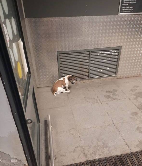 Замечена собака в пятерочке. Белая с коричневыми пятнами