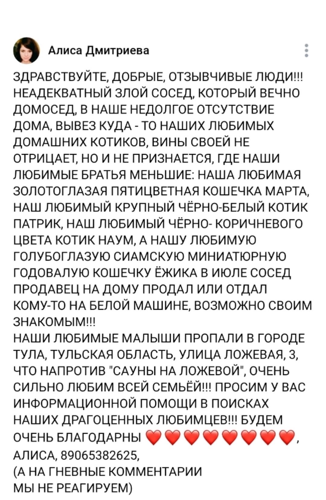 ЗДРАВСТВУЙТЕ, ДОБРЫЕ, ОТЗЫВЧИВЫЕ ЛЮДИ!!! ПО ВИНЕ ЗЛОГО НЕАДЕКВАТНОГО СОСЕДА ПРОПАЛИ СРАЗУ ВСЕ НАШИ ДЕЛИКАТНЫЕ ЛЮБИМЫЕ КОТИКИ, В НАШЕ НЕДОЛГОЕ ОТСУТСТВИЕ ДОМА!!! ОЧЕНЬ СИЛЬНО ЛЮБИМ ВСЕЙ СЕМЬЁЙ!!! !!! !!! ПРОСИМ ПОМОЩИ В ПОИСКАХ У ВСЕХ НЕРАВНОДУШНЫХ!!! БУДЕМ ОЧЕНЬ БЛАГОДАРНЫ!!! ( ГОРОД ТУЛА )